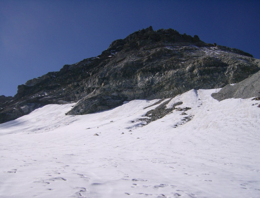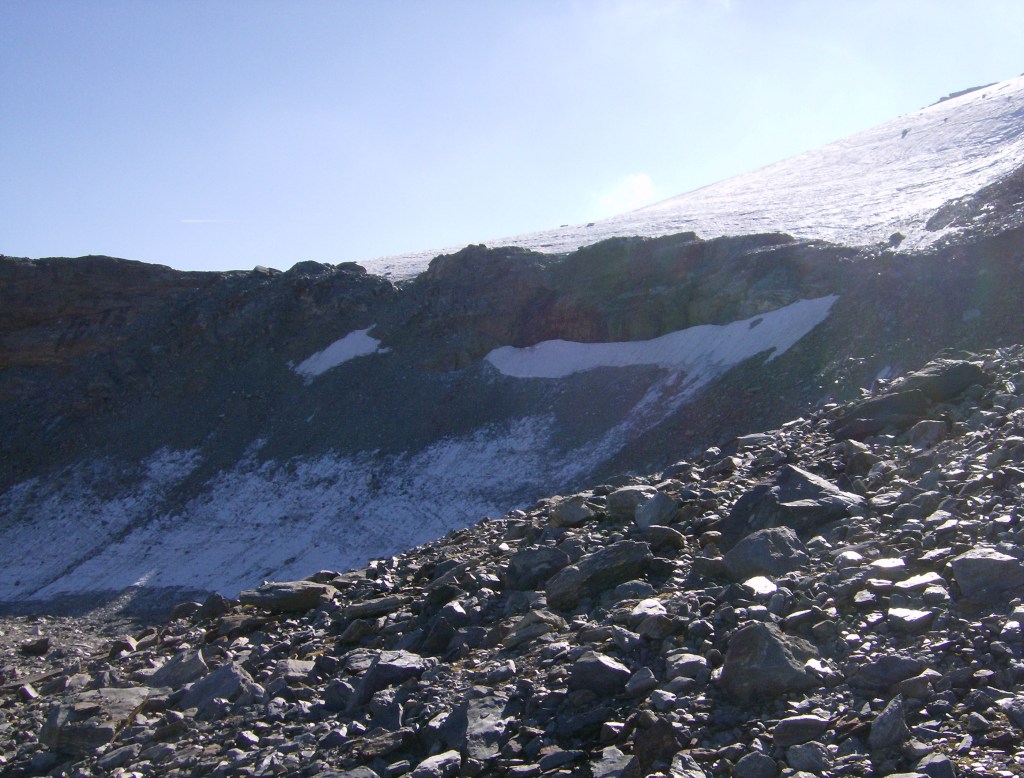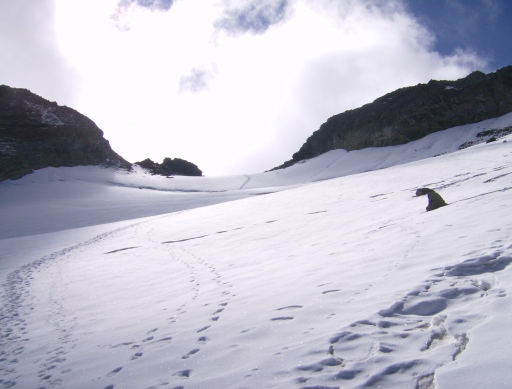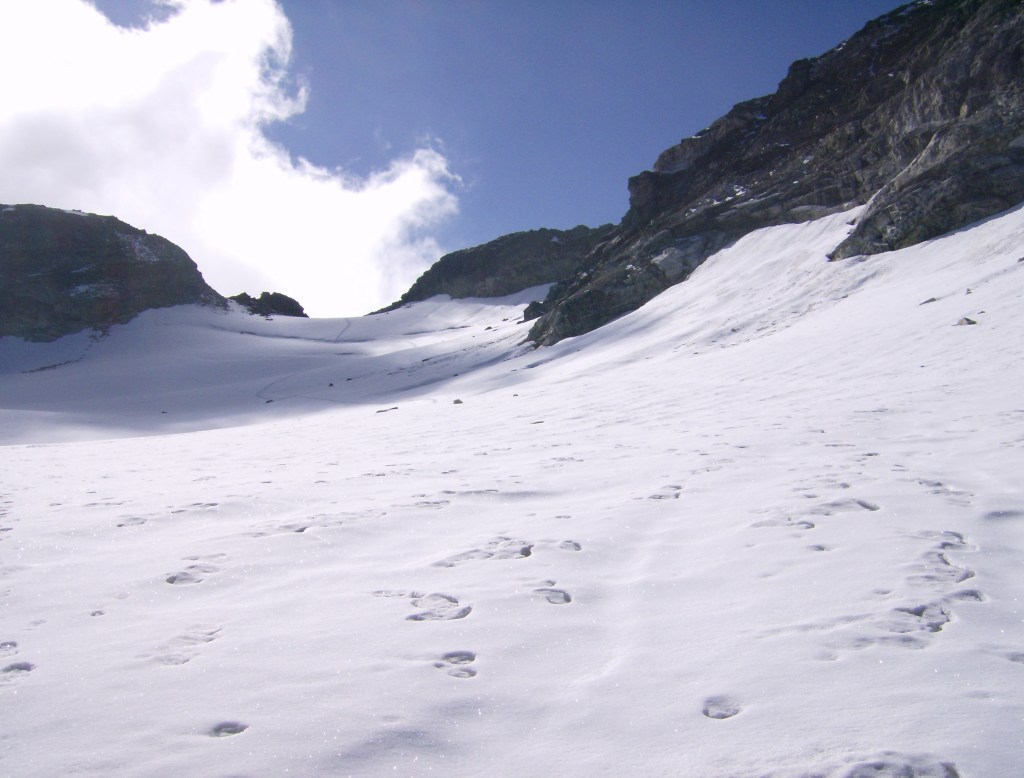 La nieve al principio está durilla, «costrosa», por encima de un estrato de hielo duro. No es desde luego de los más extensos de la cadena alpina, pero hay grietas y hay que ir con ojo. Yo voy solo, lo cual no es lo más prudente, pero en este periodo se espera que todas las grietas estén bien abiertas y sobre todo visibles.