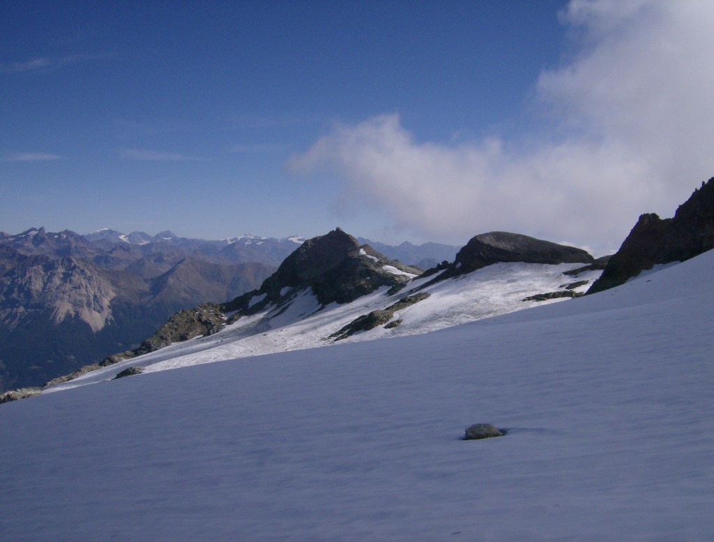Según voy subiendo el camino se vuelve más claro. No hay que llegar al collado más amplio, justo a la derecha de la Cima de Val Fontana, a 3178 m, sino ir ciñendo el borde del glaciar y salir hacia el SW a buscar el Colletto dello Scalino (3209 m), situado entre la discreta antecima del Scalino y la cumbre. El panorama lógicamente va mejorando aún más, y ya se divisan los colosos austríacos, como el Wildspitze (3768 m) y sudtiroleses, con el Ortler (3905 m).
