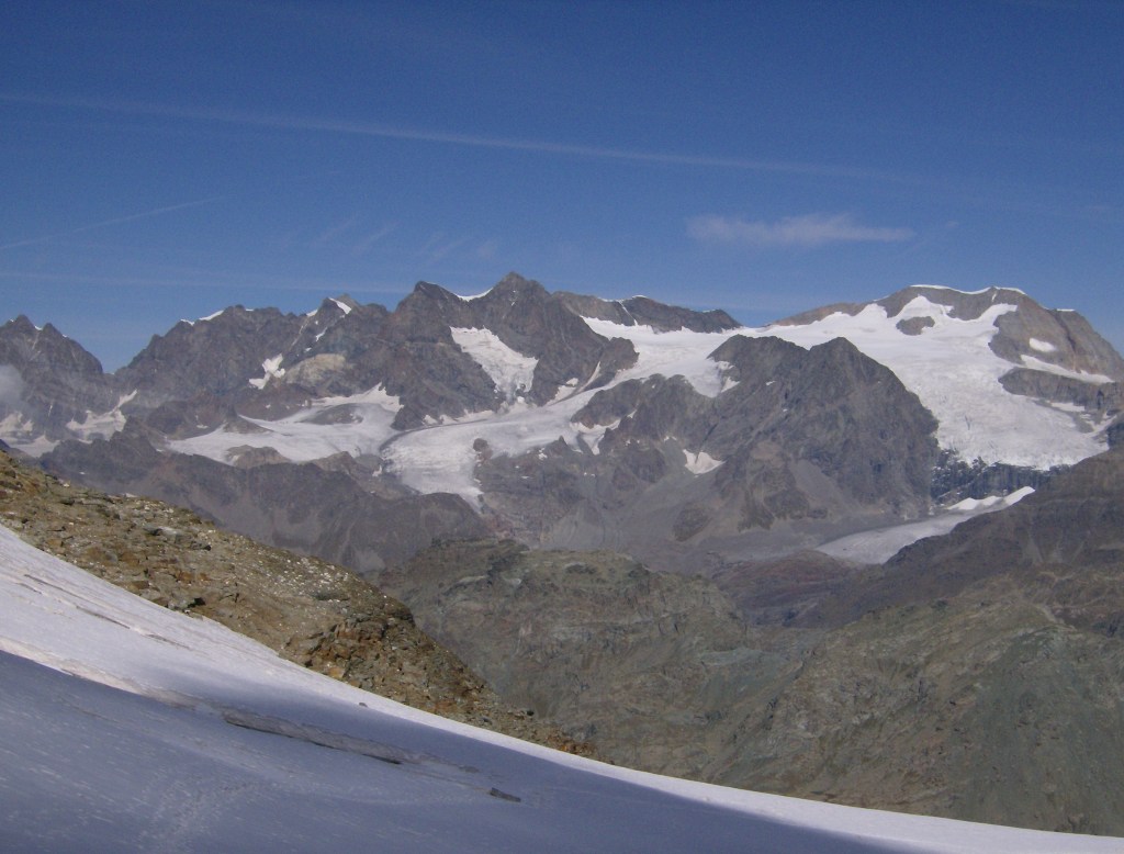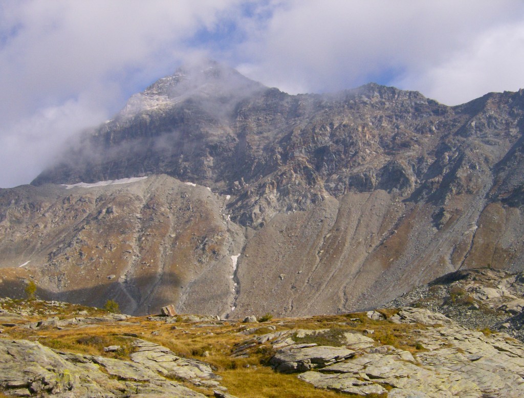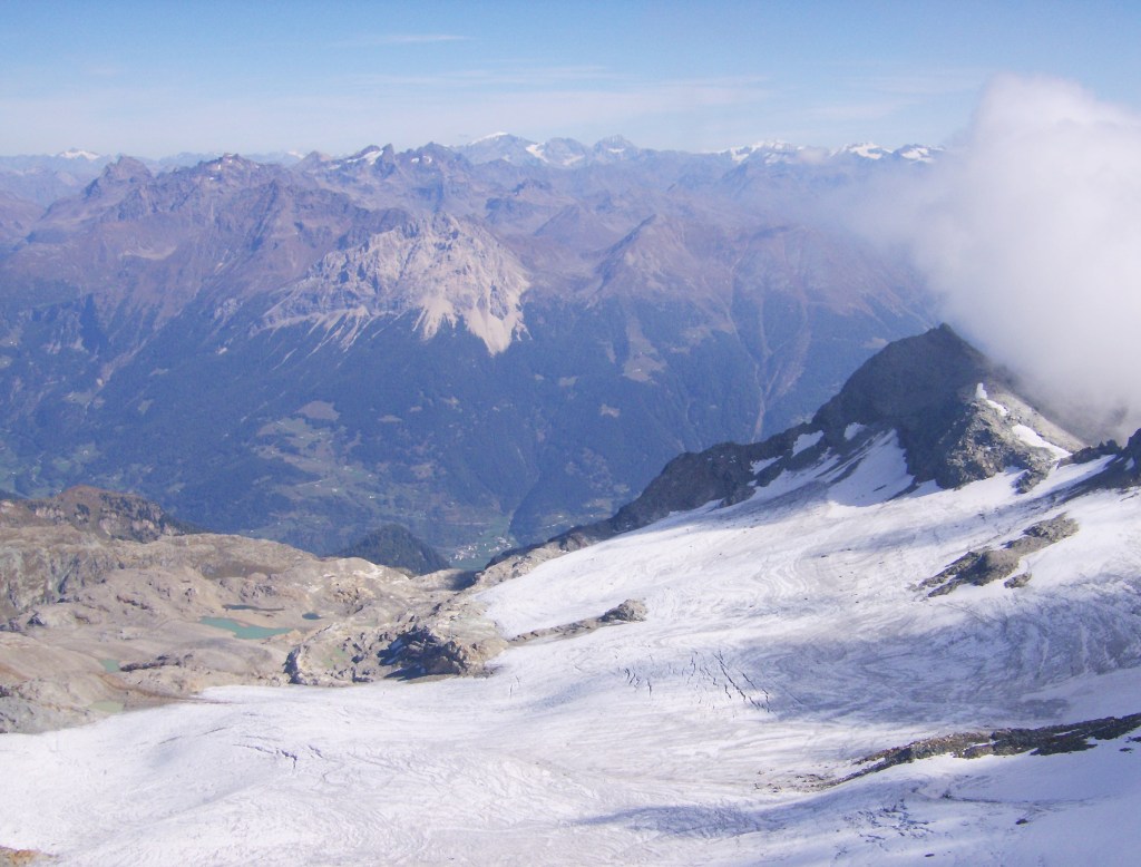 Desde aquí una breve pero dura escalada me deposita en el ansiado collado. El viento del sur ha traído algunas nubes que se enganchan a la cima del Valletto. La vista del glaciar es imponente.