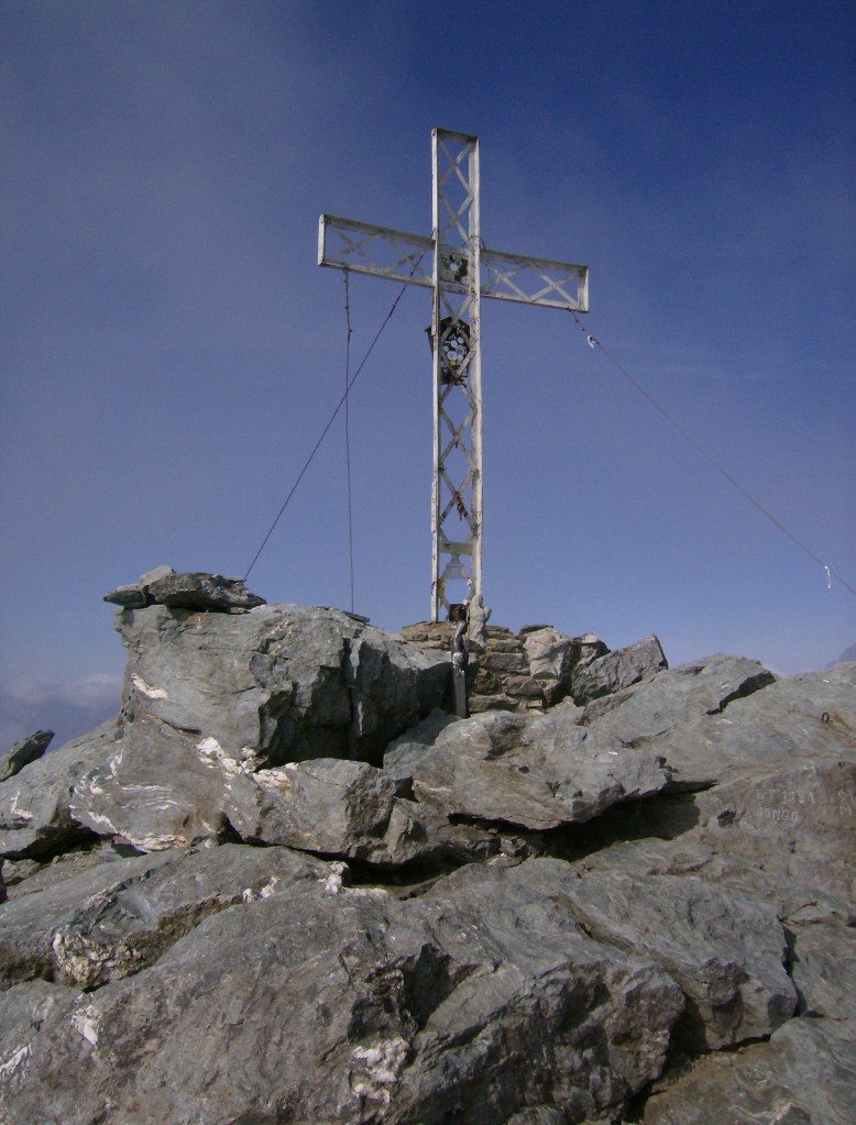 Es la una en punto cuando alcanzo el punto más elevado, marcado por una gran cruz y dos estatuas de la Madonna. He tardado poco más de cuatro horas desde el aparcamiento, no es mal tiempo desde luego. Es justo el mediodía solar y ya sólo queda descender. Pero ahora es el momento de disfrutar de esta estupenda cima en absoluta soledad. Creo haber mencionado ya la grandiosidad del panorama.
