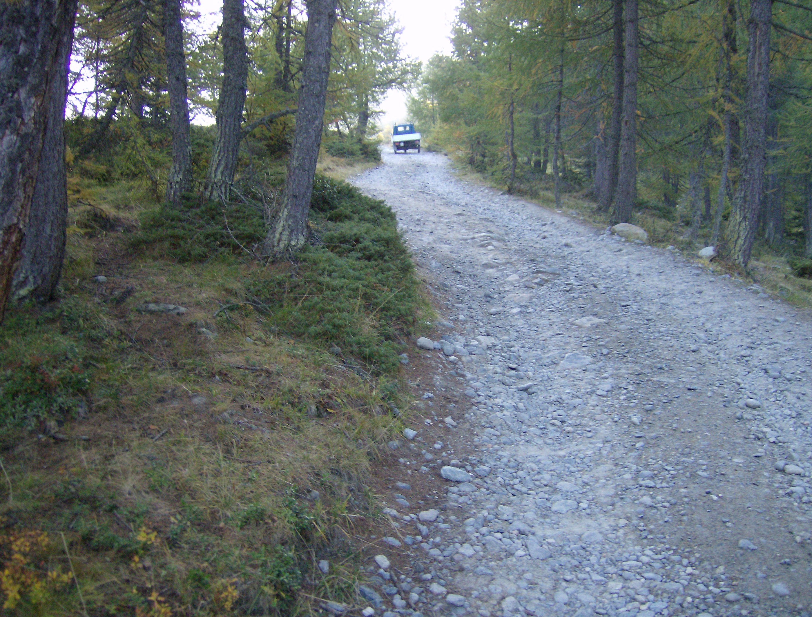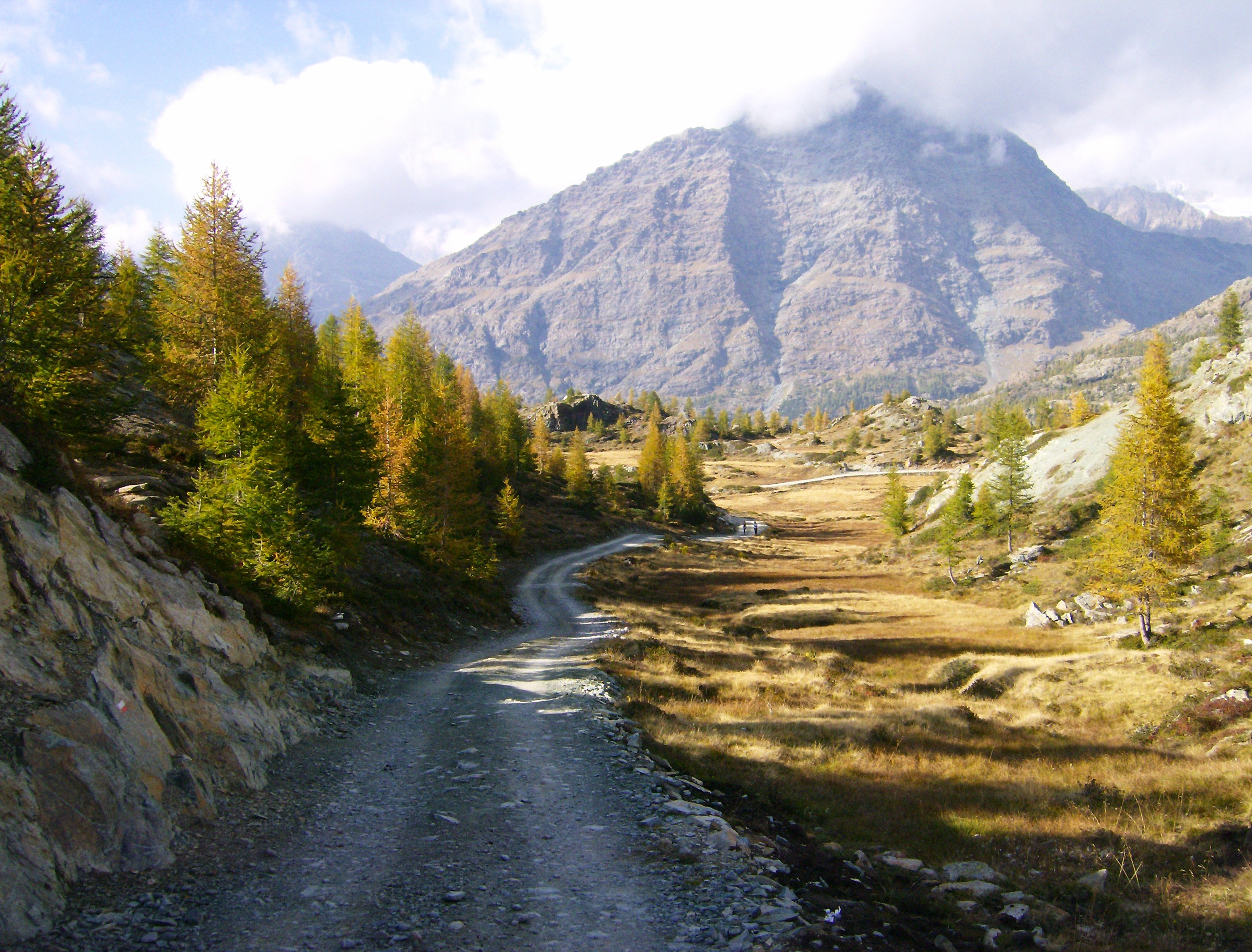 Después de una media hora, empiezo la bajada. Sin la menor amenaza de cambio de tiempo en el horizonte, sólo tengo que dejarme ir y gozar del ambiente que me rodea. Cuando termino el descenso propiamente dicho, y con él los peligros de resbalones y caídas, en las inmediaciones del Alpe Prabello, las vistas son maravillosas. La cálida luz de otoño, con el día declinando, realza los colores del cielo y de los bosques de alerces que ya empiezan a amarillear.