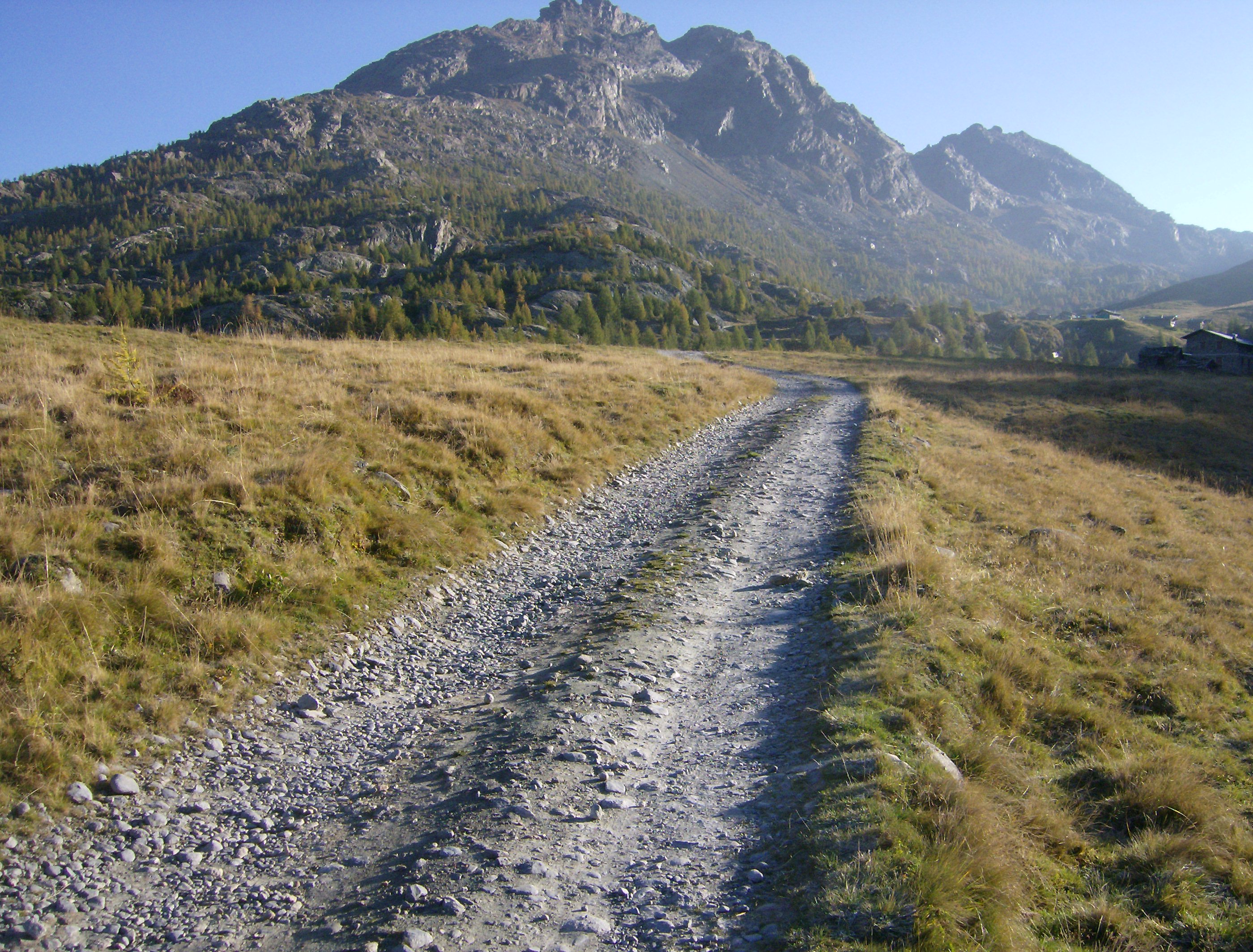 Más adelante el sendero se junta con la pista que llega desde el Refugio Ca’Runcatsch. Hacia el Oeste, el Sol levante ilumina el Monte Disgrazia (3678 m), una de las montañas más prestigiosas de Lombardía.