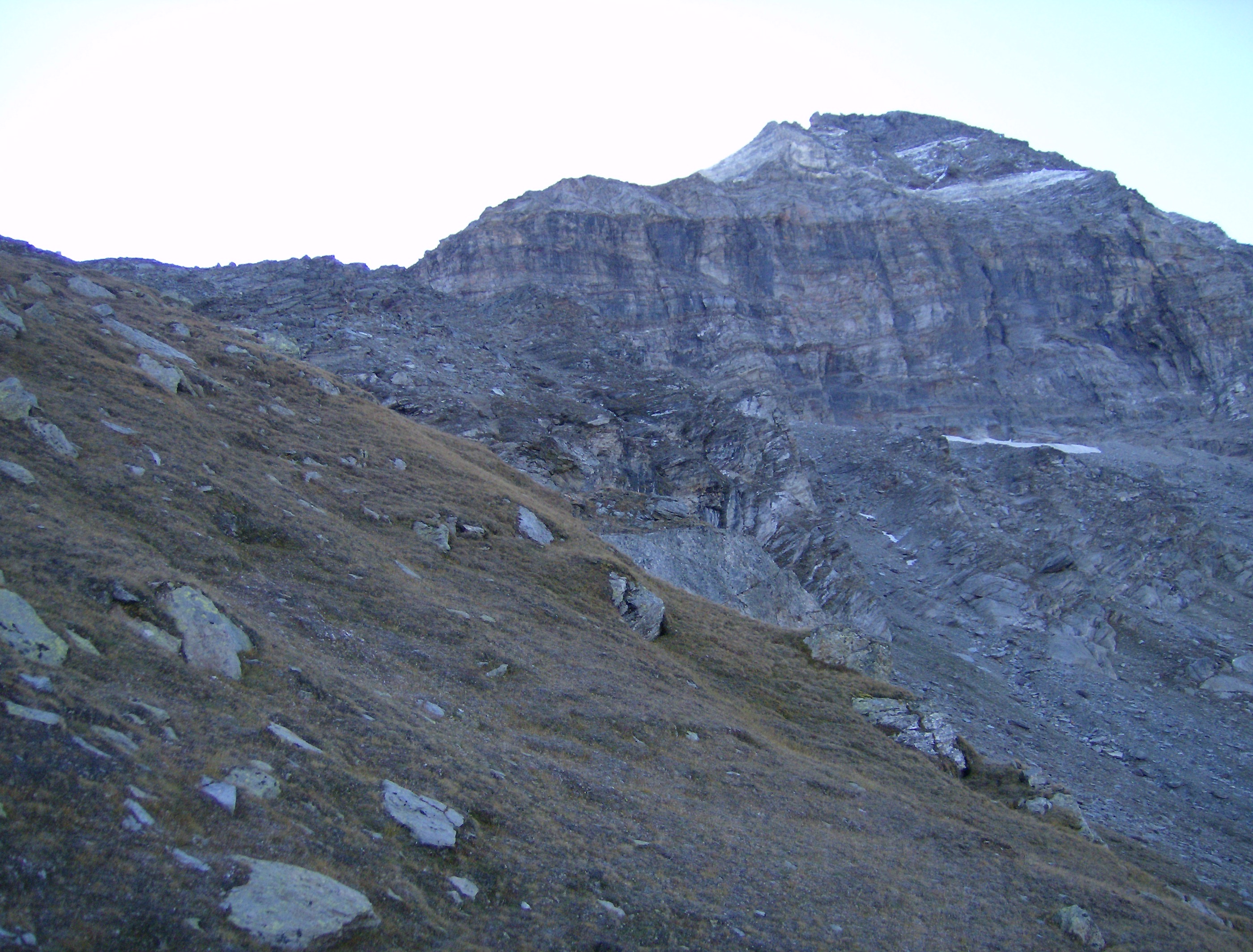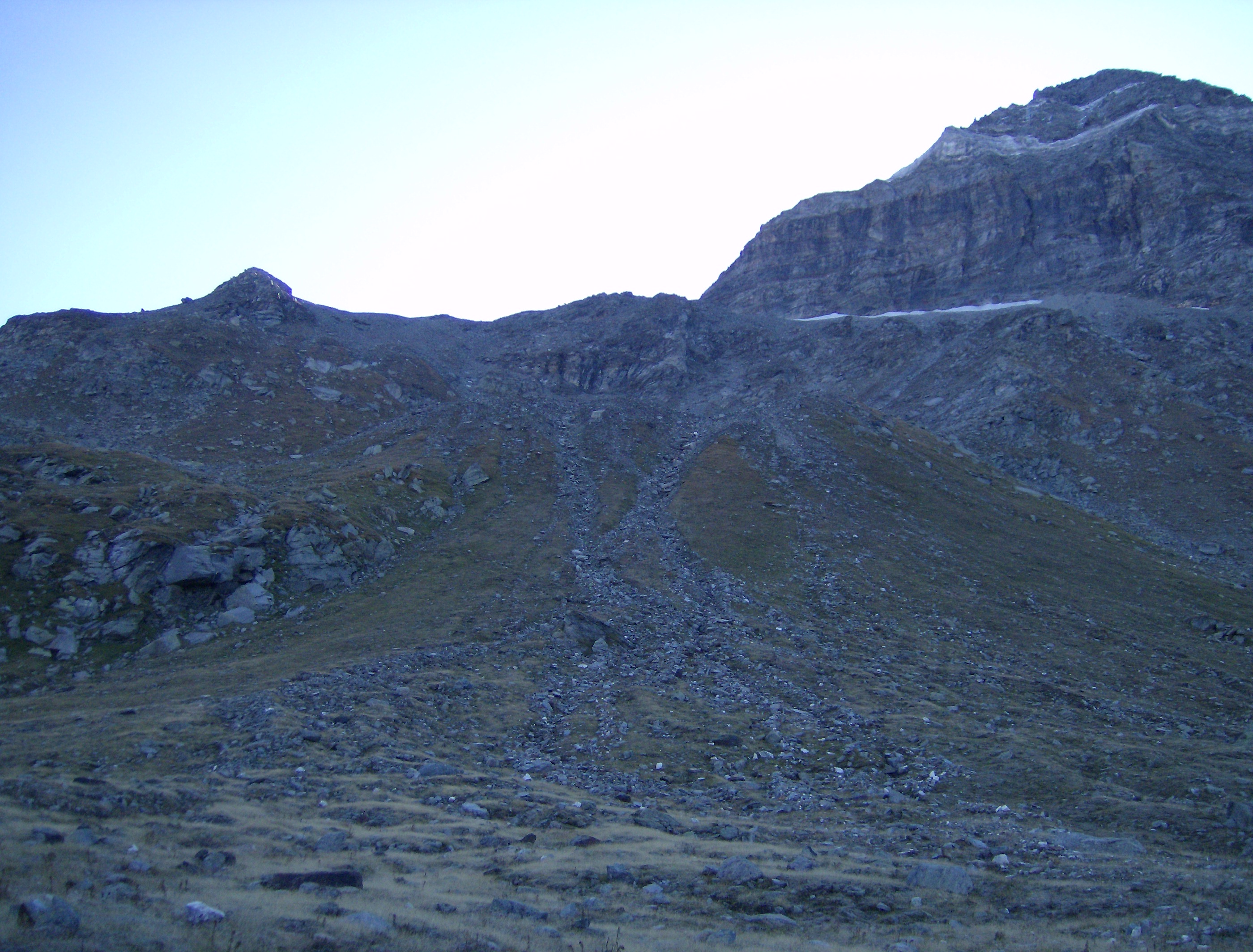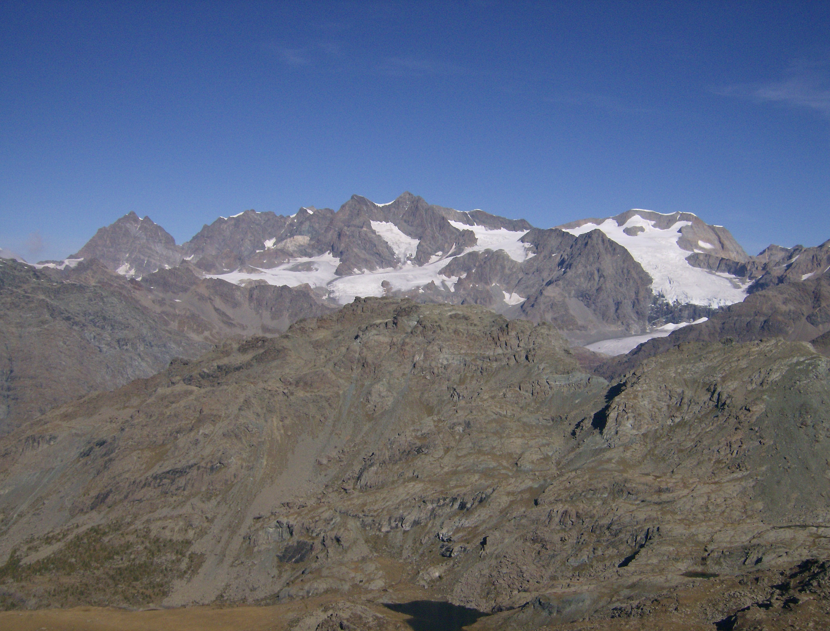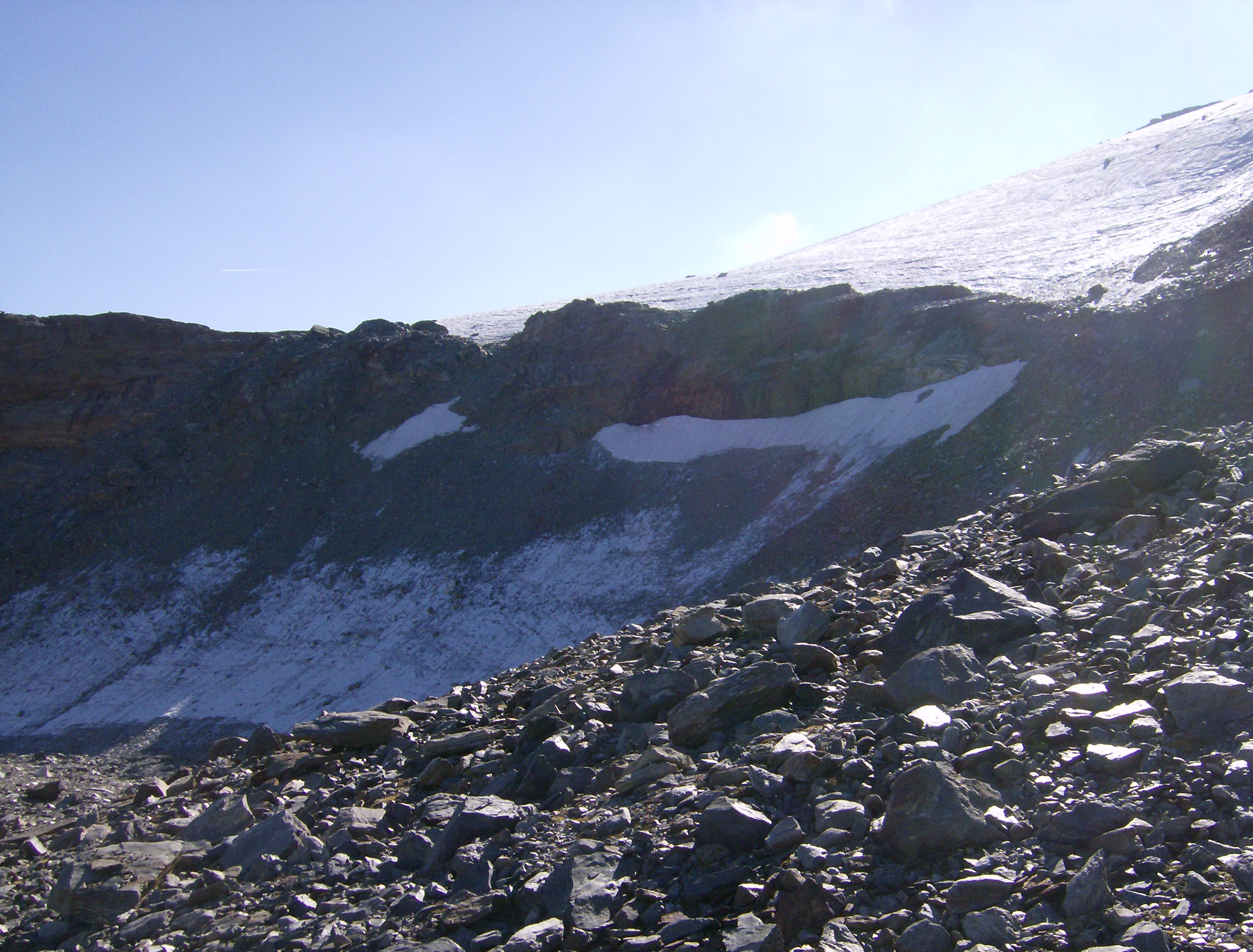Desde aquí se aprecia mejor la verdadera rimaya, situada por encima de donde he pasado, dificultando el acceso al collado de Val Fontana. Acostumbrado a las grandes extensiones de hielo de los cuatromiles, este glaciar es «pequeño», pero no cabe comparación con nuestros glaciares pirenaicos. Decididamente aquí hay que venir con equipo apropiado, y pensárselo bien antes de meterse en una solitaria.