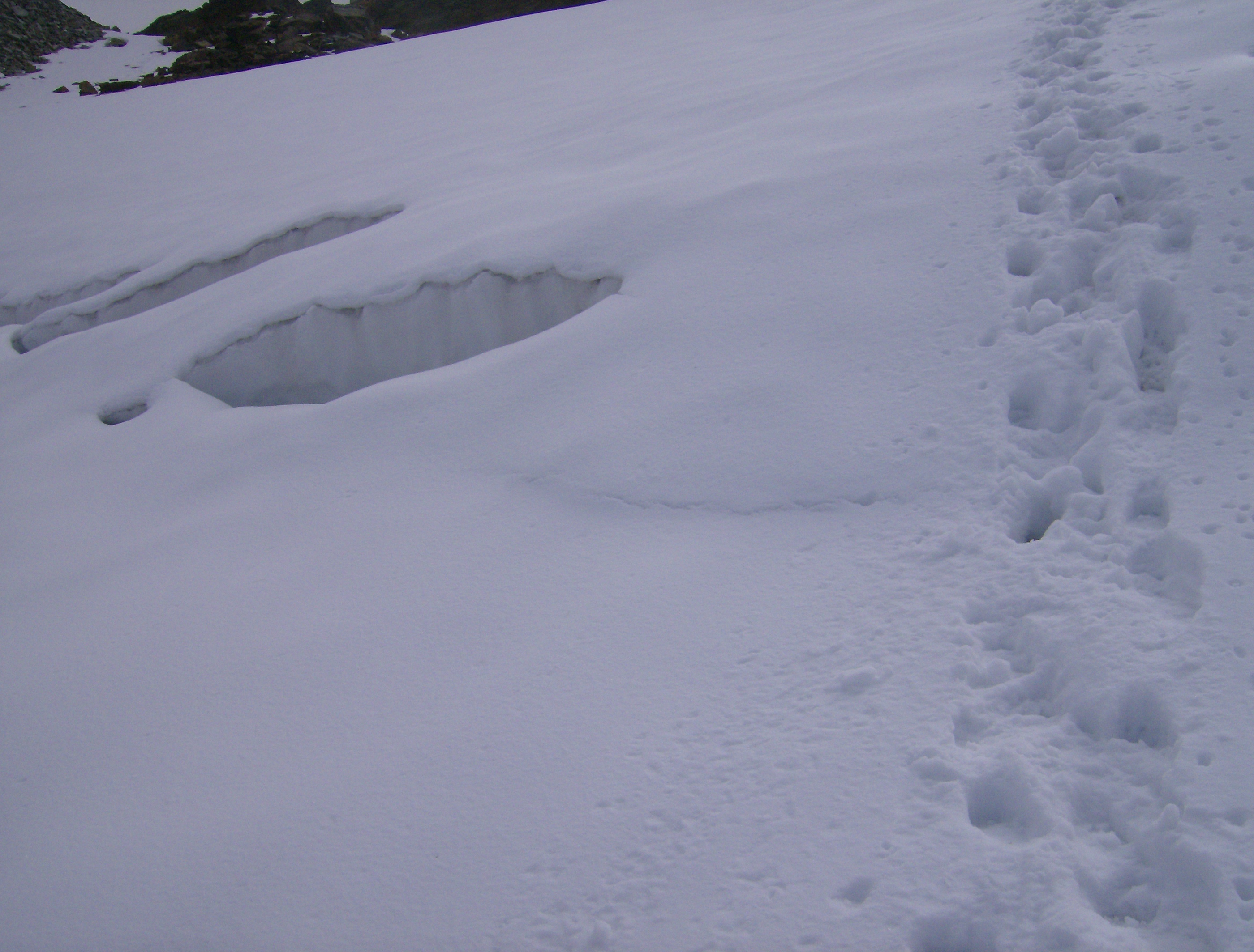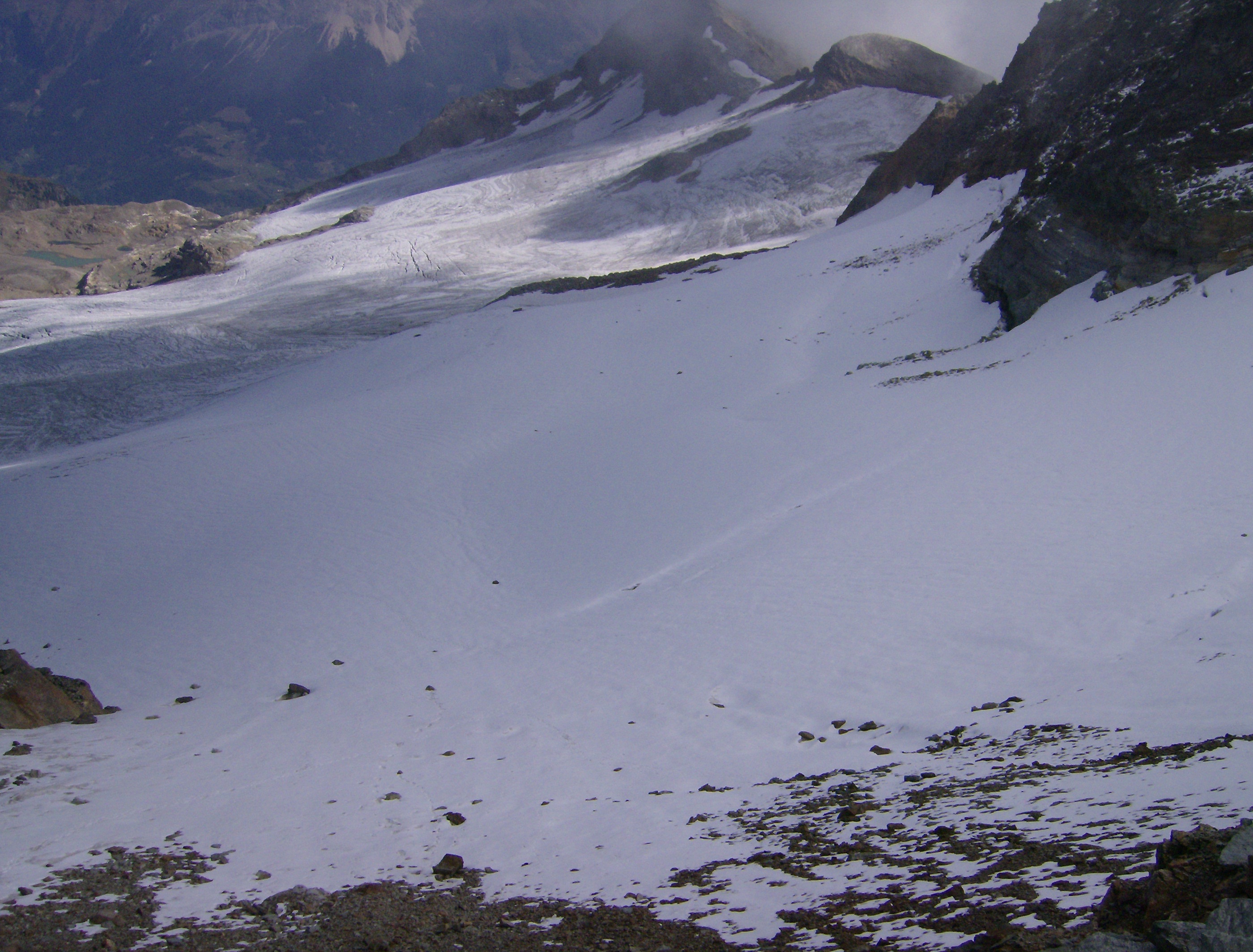 La nieve al principio está durilla, «costrosa», por encima de un estrato de hielo duro. No es desde luego de los más extensos de la cadena alpina, pero hay grietas y hay que ir con ojo. Yo voy solo, lo cual no es lo más prudente, pero en este periodo se espera que todas las grietas estén bien abiertas y sobre todo visibles.