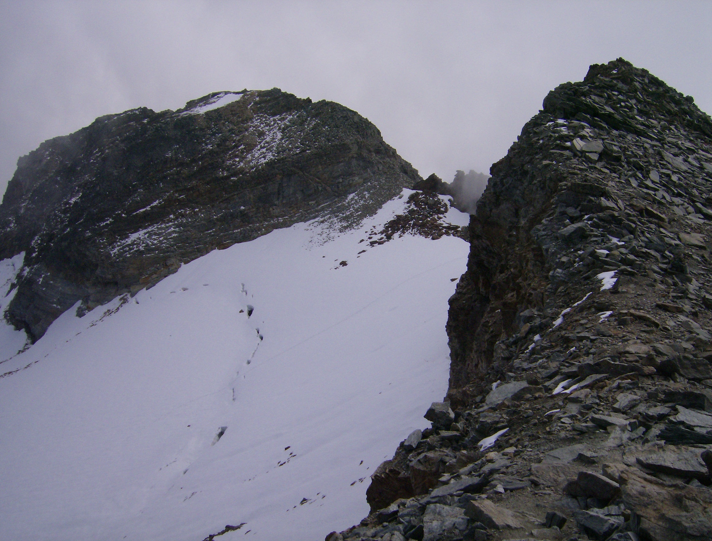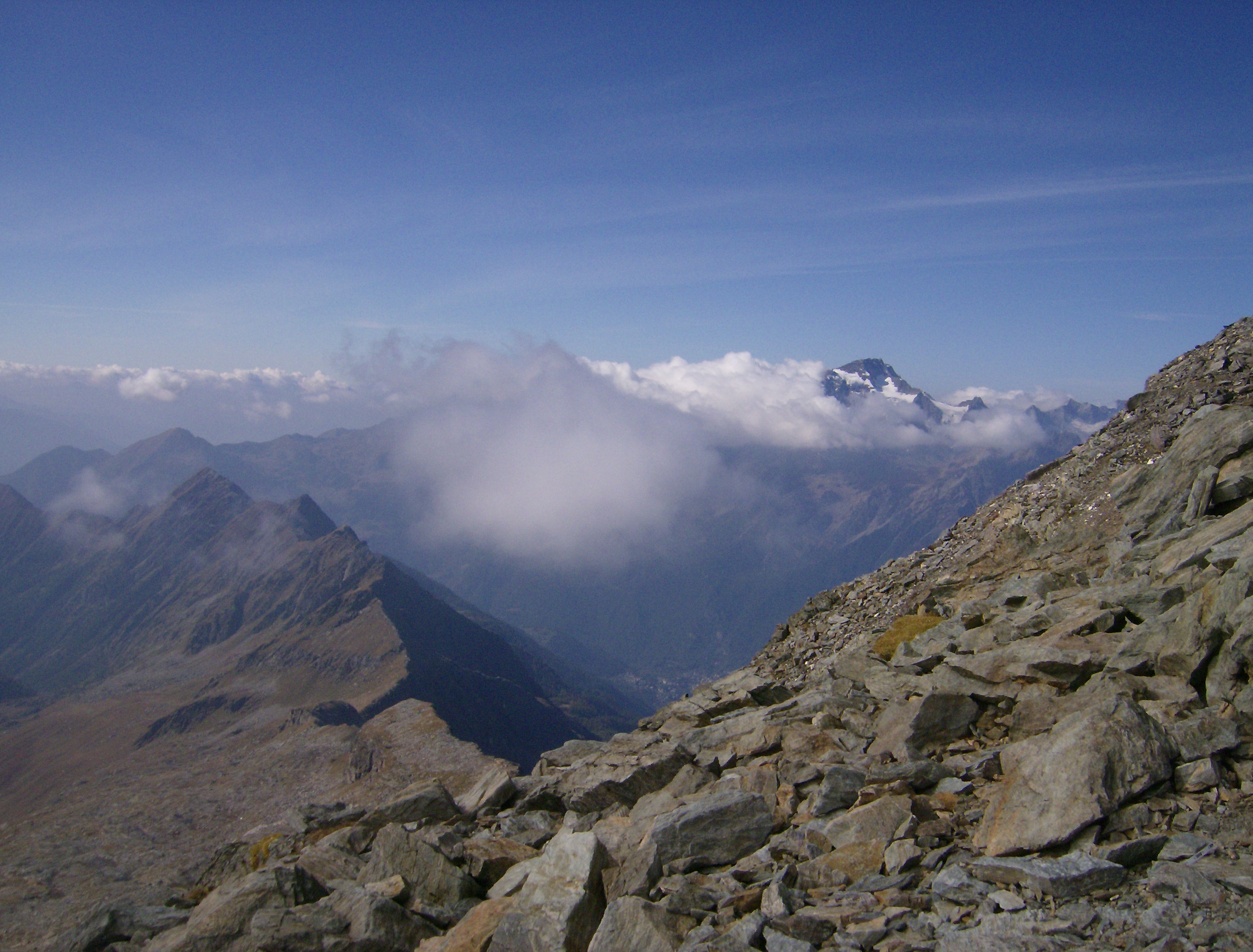 Desde aquí una breve pero dura escalada me deposita en el ansiado collado. El viento del sur ha traído algunas nubes que se enganchan a la cima del Valletto. La vista del glaciar es imponente.