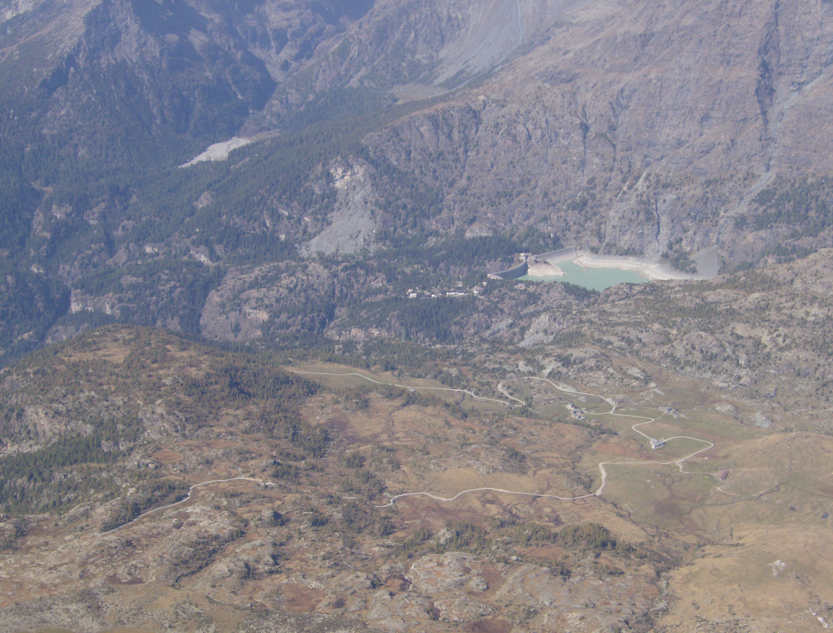 Desde aquí distingo perfectamente el embalse de Campo Moro y el trazado de la pista que, pasando por Alpe Campagneda y Ca’Runcasch, llega al Alpe Prabello. Esta es la traza que usan los esquiadores en invierno. Con el zoom de la cámara, llego a intuir el sendero que he utilizado para atajar la gran curva de la pista.