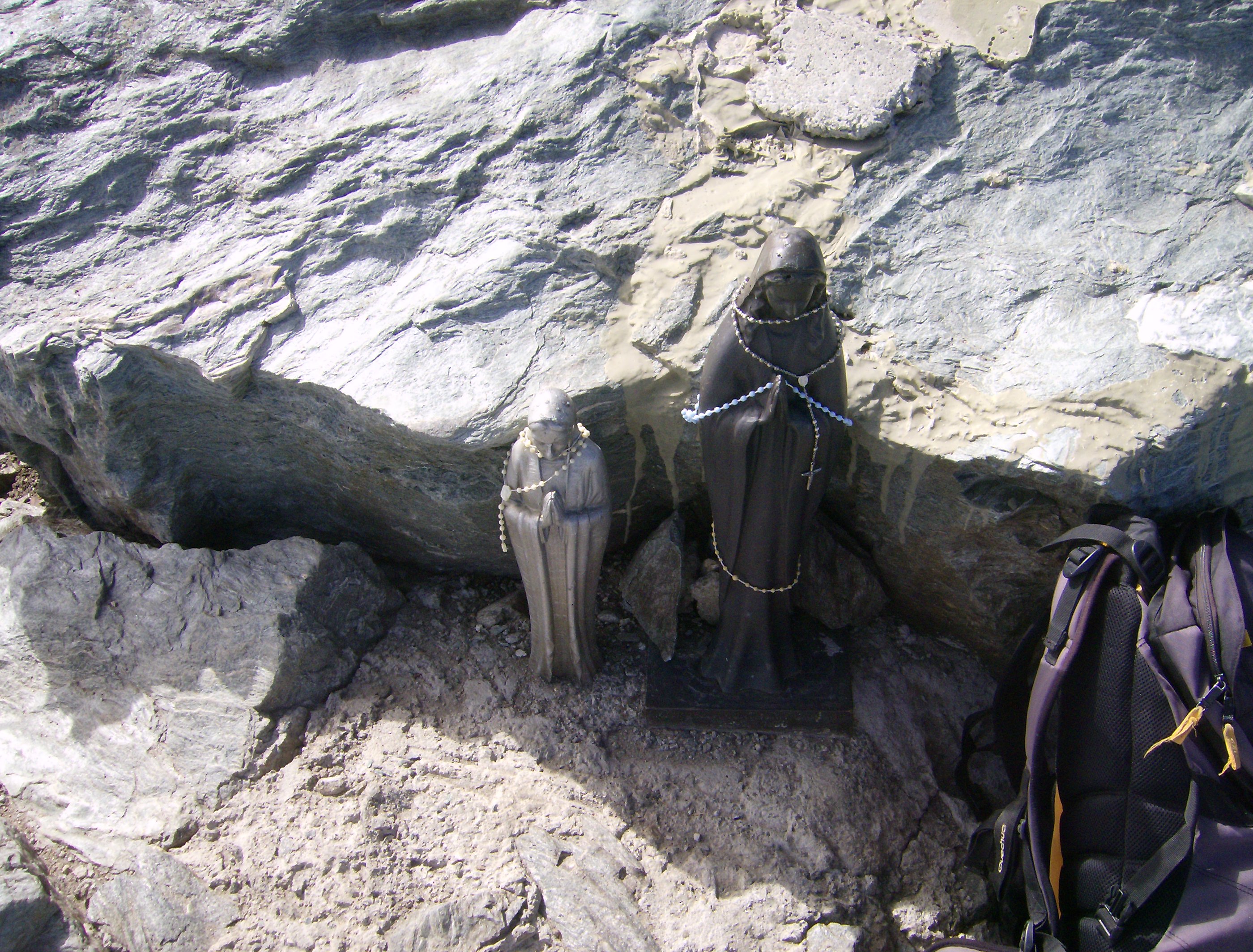 Es la una en punto cuando alcanzo el punto más elevado, marcado por una gran cruz y dos estatuas de la Madonna. He tardado poco más de cuatro horas desde el aparcamiento, no es mal tiempo desde luego. Es justo el mediodía solar y ya sólo queda descender. Pero ahora es el momento de disfrutar de esta estupenda cima en absoluta soledad. Creo haber mencionado ya la grandiosidad del panorama.