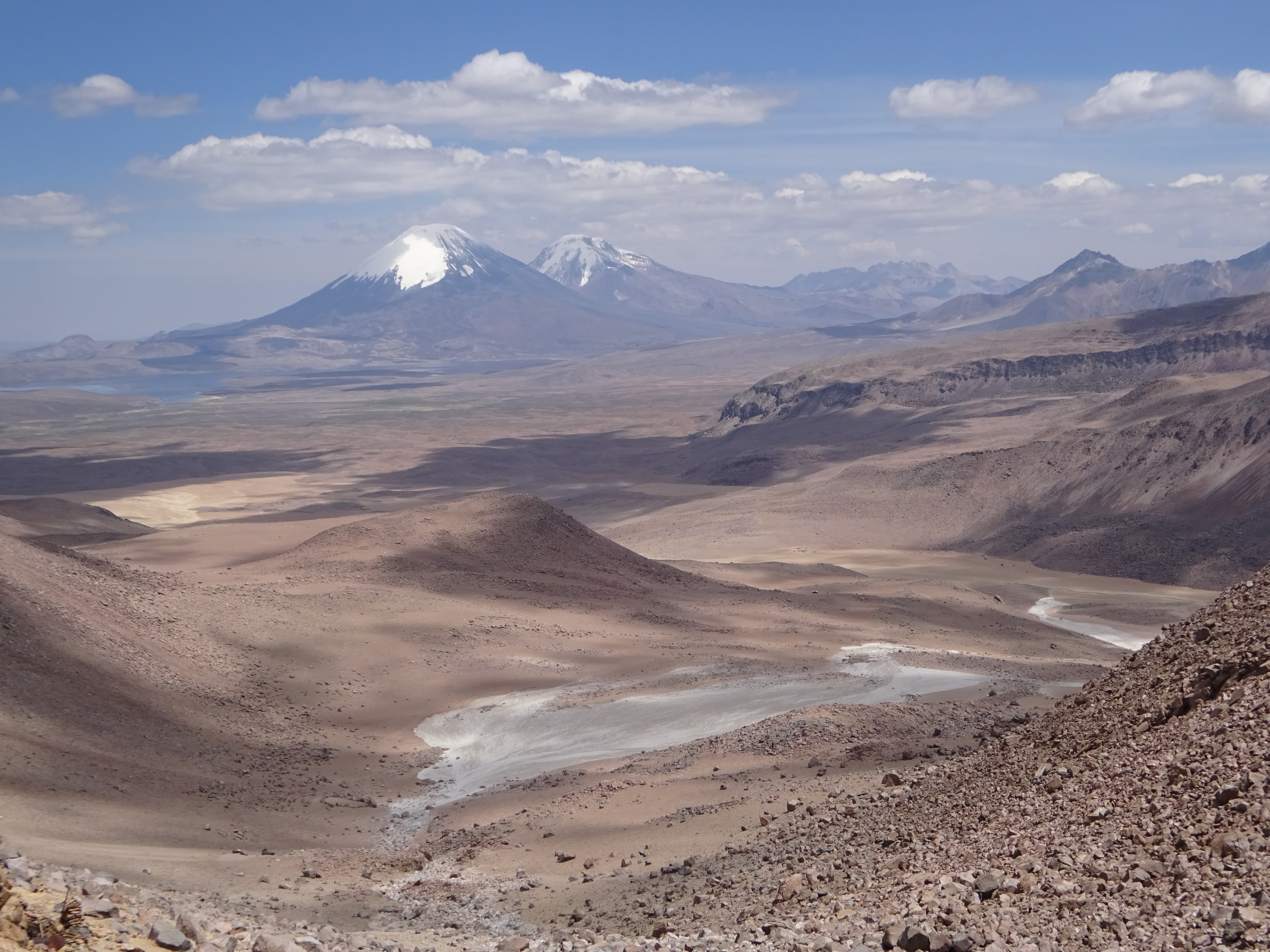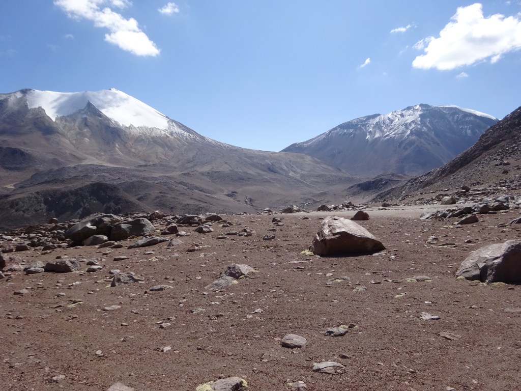 Casi sin querer me despego un poco de mis compañeros, haciendo eslalon entre algunos grandes bloques. El camino se mantiene siempre por el lado derecho de la vaguada. Las vistas sobre el Parinacota y el Pomerape son sobrecogedoras.