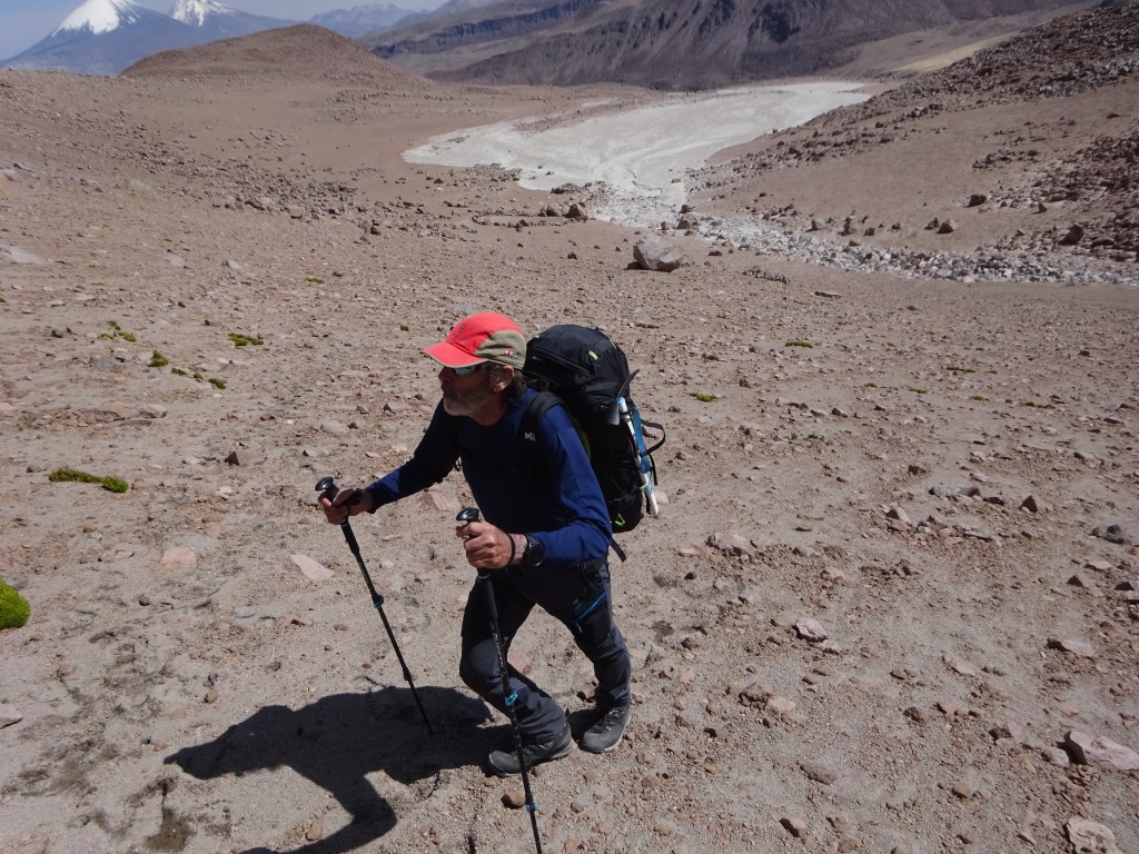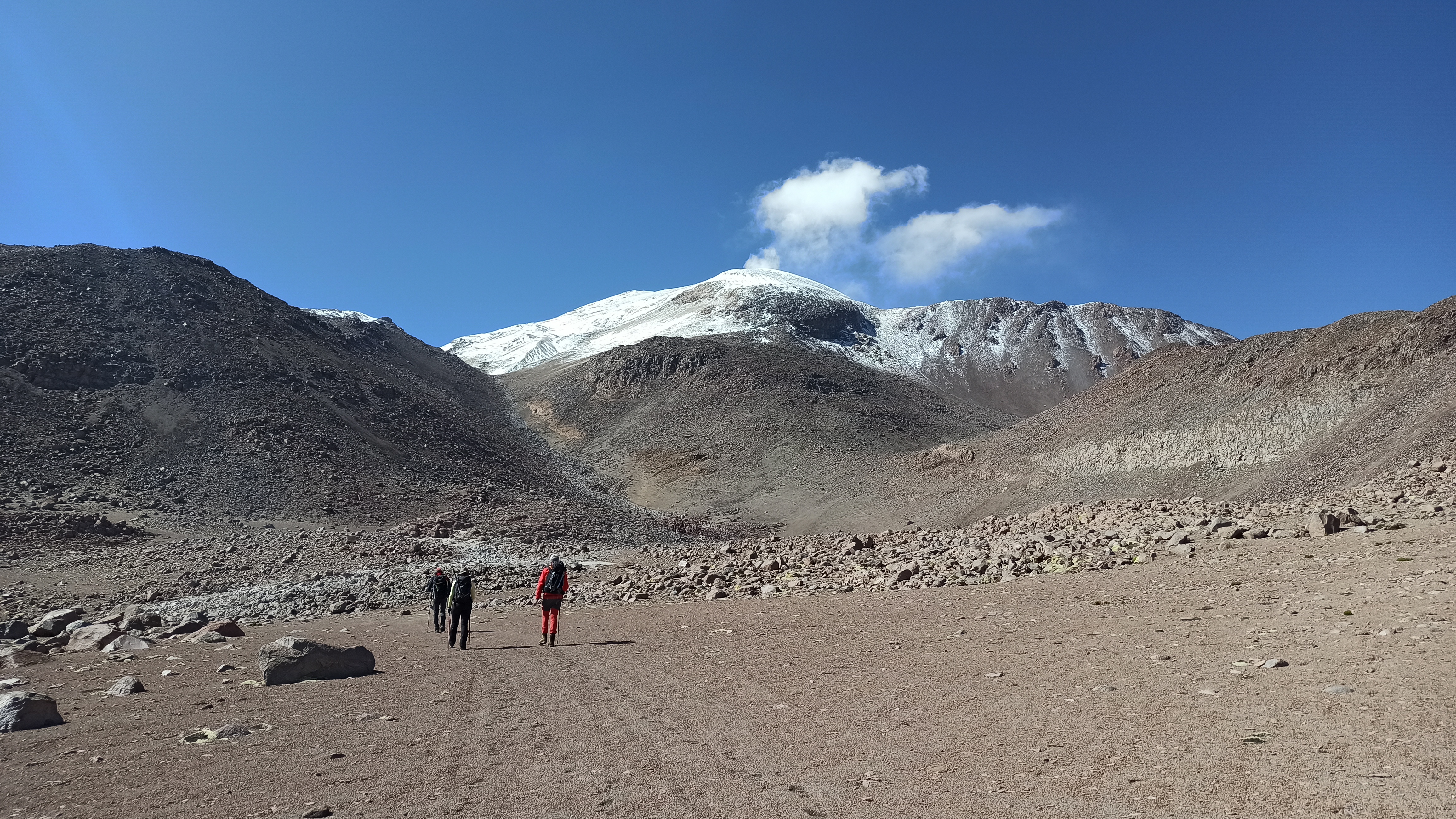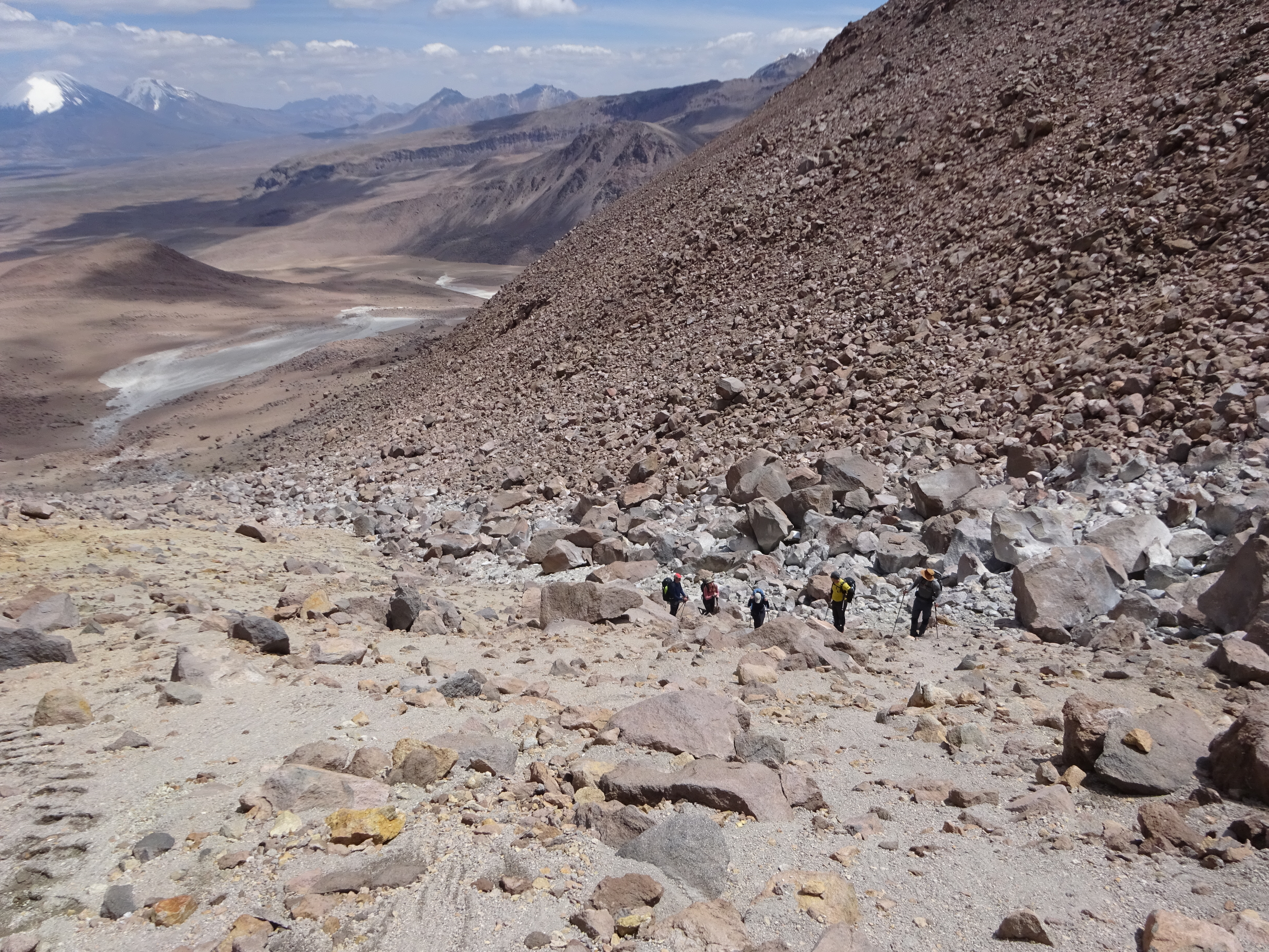Las diez de la mañana no es una hora apropiada para empezar a subir un seismil. Pero no tenemos elección, porque mañana hay que viajar a Calama para devolver los vehículos. Dando por perdida la cumbre, decidimos que vamos para arriba y llegaremos hasta donde se pueda. Hay que aclimatar, y en todo caso será mejor que nada.