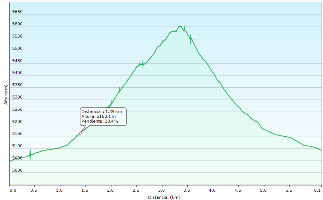 Al cabo de una hora estamos a unos 5230 m, hemos hecho casi 200 m de desnivel. Marie y Laia se quedan un poquito atrás. Empiezo a pensar que quizás tengamos una remotísima posibilidad de llegar arriba.