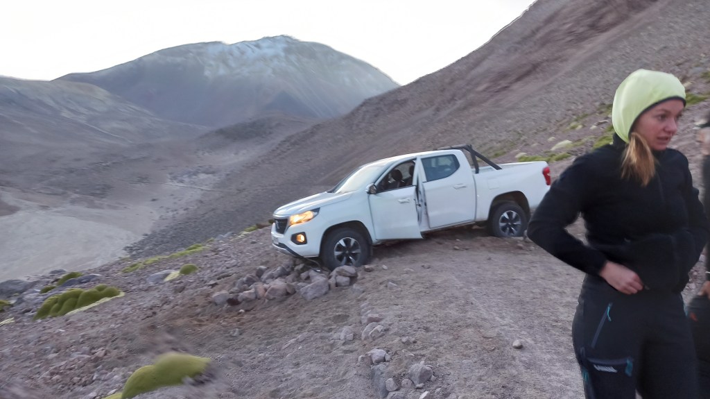 Y si bien el Guallatiri se sube cómodamente en una sola jornada, sin necesidad de aproximación, hay que echar a andar muy temprano. Al no poder hacer campamento, teníamos dos alternativas. Una, subir al CB con las camionetas antes del atardecer, y dormitar algo, bien abrigados, en su interior. O bien dormir cómodamente en nuestro hotel, levantarnos muy pronto y conducir a oscuras por una pista que no conocíamos, en un territorio frecuentado por traficantes de personas y cosas peores…