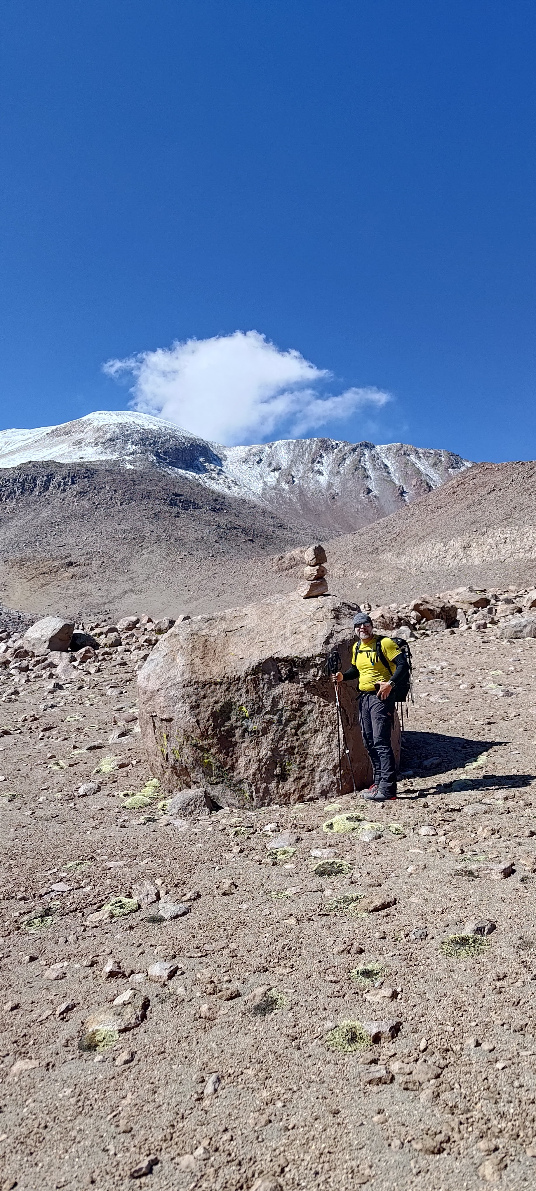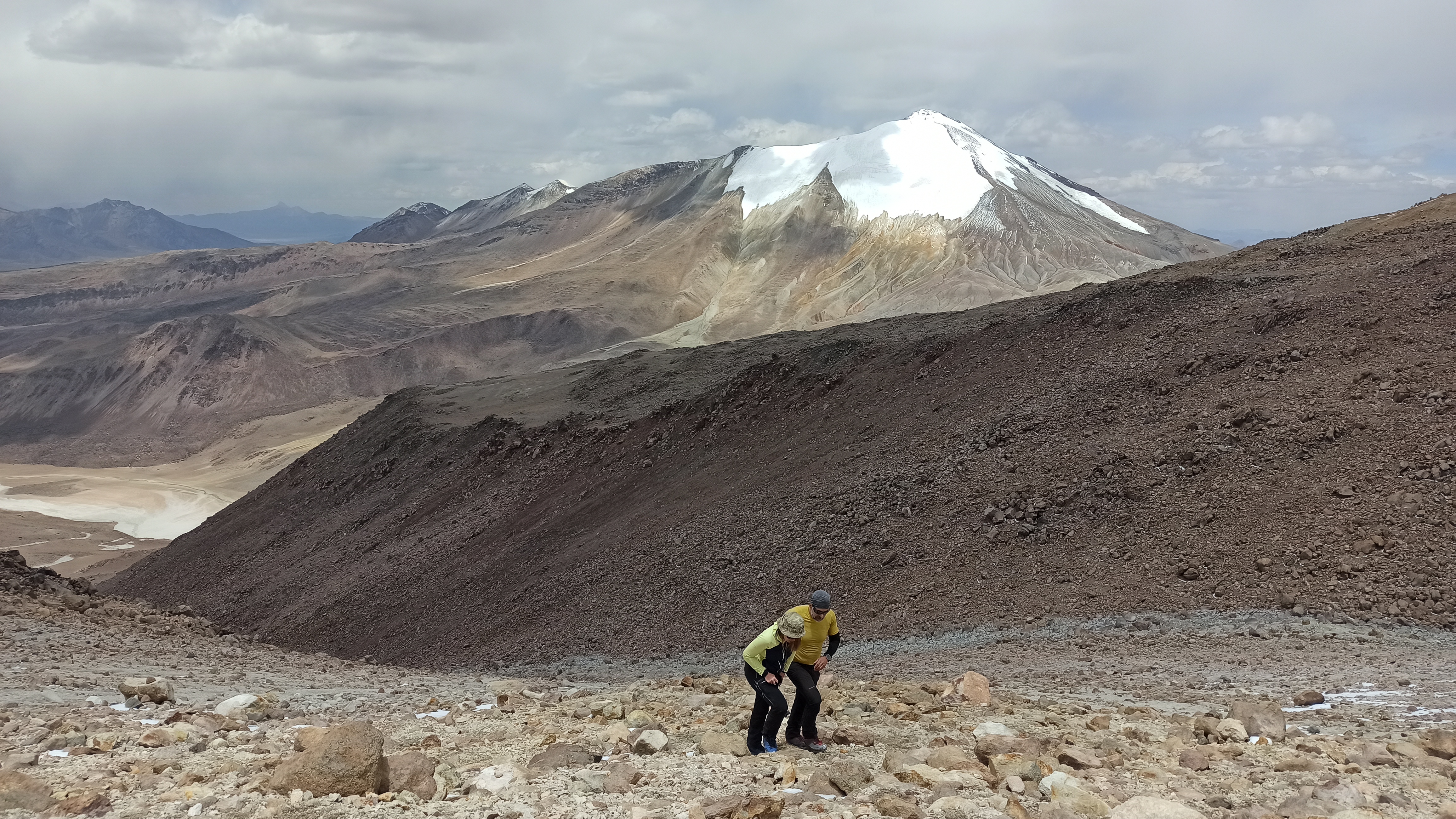 Convencemos a Marie para que ella también tenga la satisfacción de alcanzar esos 5600 m. Está sufriendo mucho, ha comido poco, le da vueltas la cabeza y cada paso supone un esfuerzo gigantesco… Esto indica un serio problema de aclimatación, y desde aquí los 6893 m del Ojos del Salado se ven muy, muy lejanos. Pero aquí y ahora, ha llegado más alto que nunca antes en su vida, e intentamos que lo disfrute cuanto pueda.