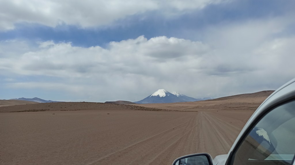 Ahora sí que podemos respirar, relajarnos, comer… Los coches arrancan sin problemas y mientras rodeamos toda la cara Norte del Guallatiri la tormenta azota su cima. Definitivamente fue una buena idea darse la vuelta. El descenso por la pista nos parece sencillísimo a la luz del día. Sin olvidar dar parte de nuestro regreso a los Carabineros de Chucuyo, regresamos a Putre. Hay que preparar el equipaje para el largo viaje que nos espera.