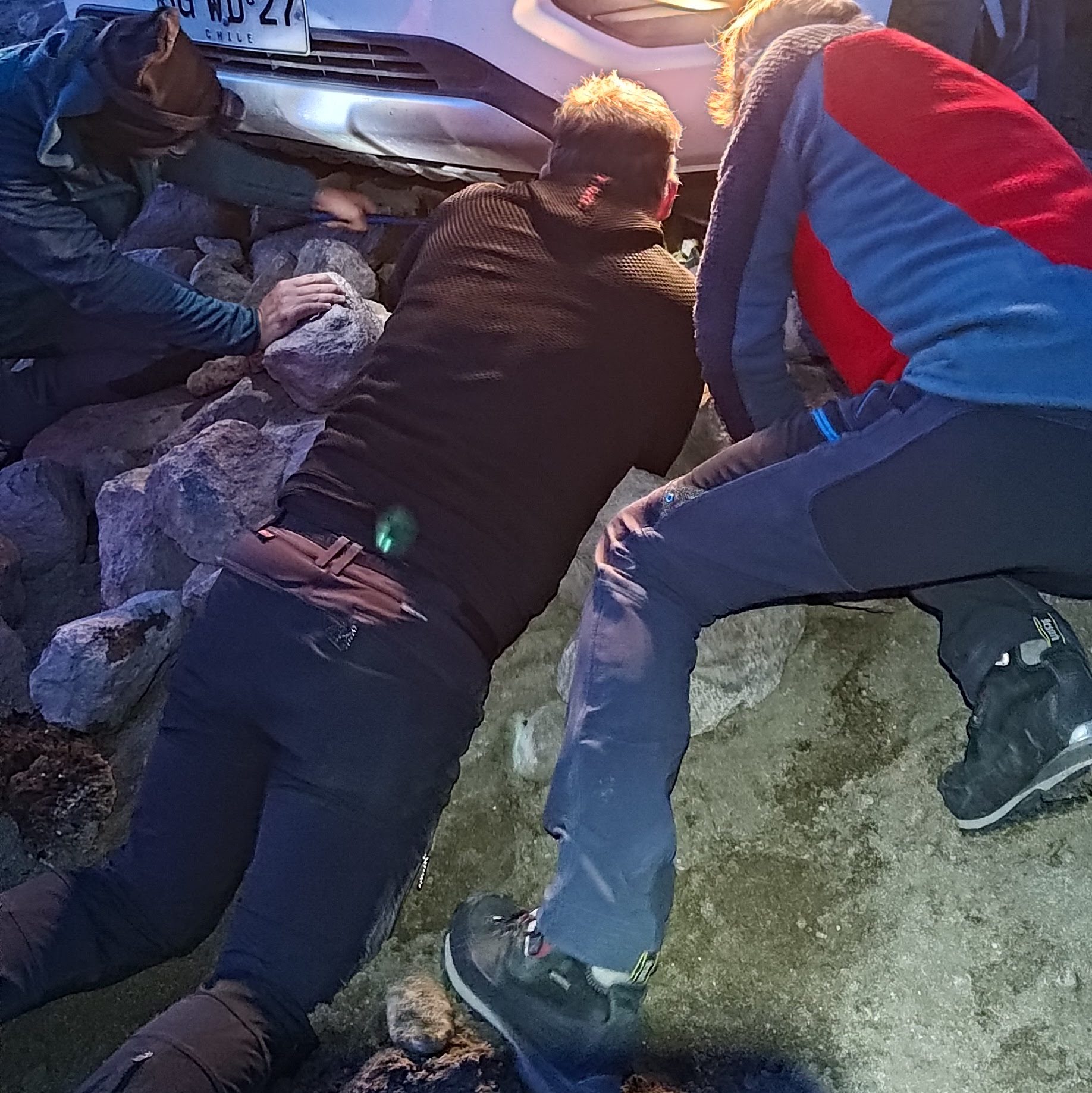 En breve, intentamos de todo. Poner piedras delante del coche para que las ruedas traccionen, quitarles presión, levantar el coche con el gato, incluso desplazarlo a pulso. No sé de dónde sacamos toda esta energía, a 5000 m de altitud, mientras las horas pasan y las primeras luces de alba nos descubren un paisaje alucinantemente bello.