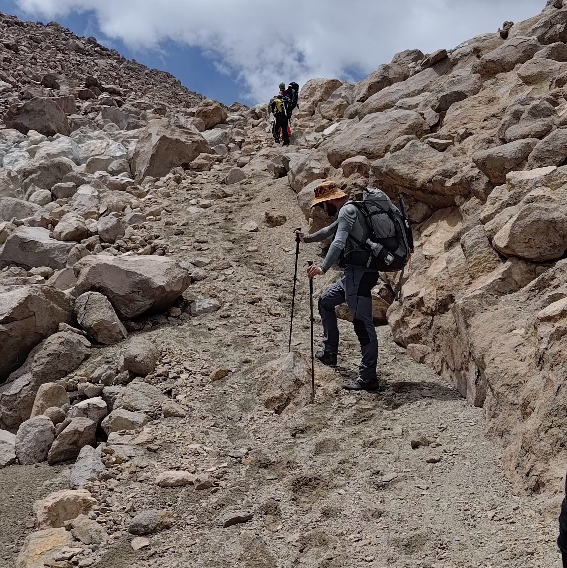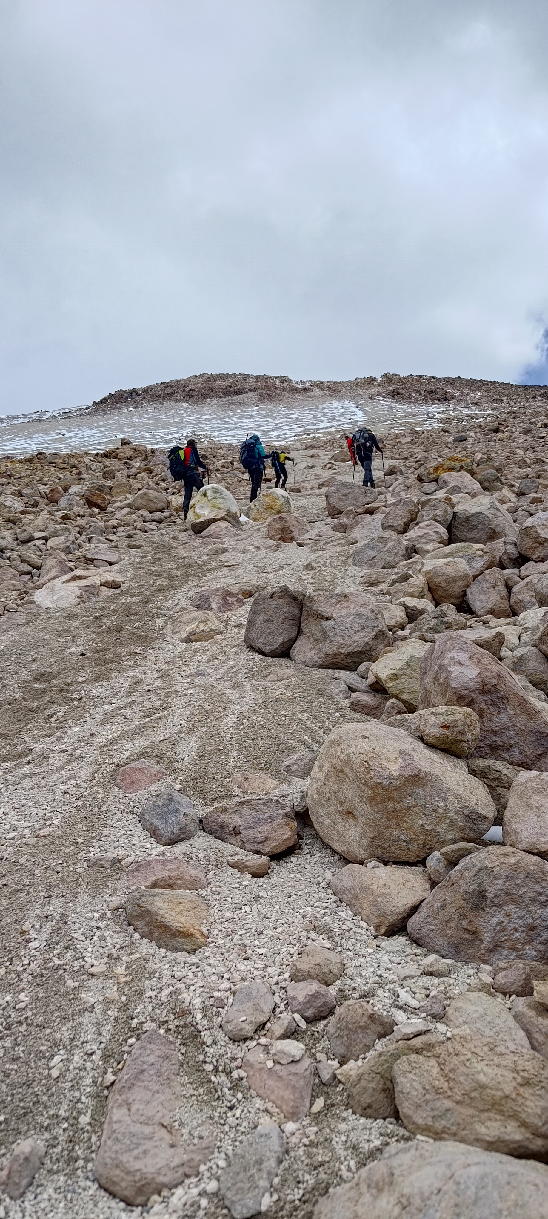 Según ganamos altura el camino se desdibuja algo y atraviesa zonas de acarreos. Se cumplen dos horas, pasadas las doce, y hemos alcanzado ya los 5420 m. Es inevitable pensar que sin el incidente del coche seguramente ya habríamos llegado a cumbre, e incluso estaríamos ya bajando.