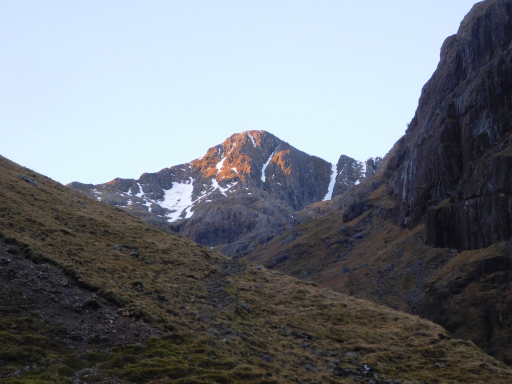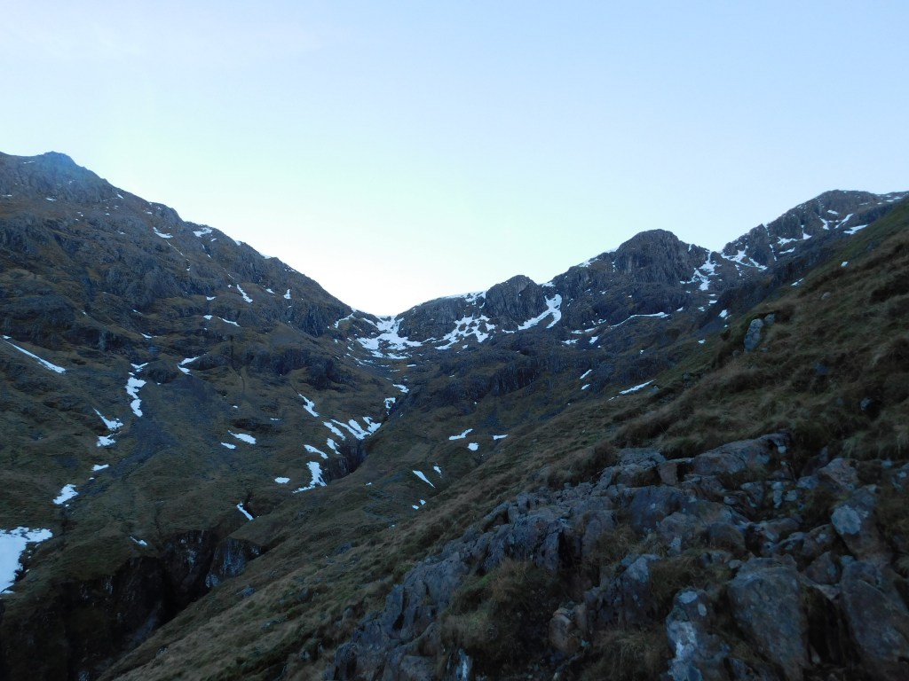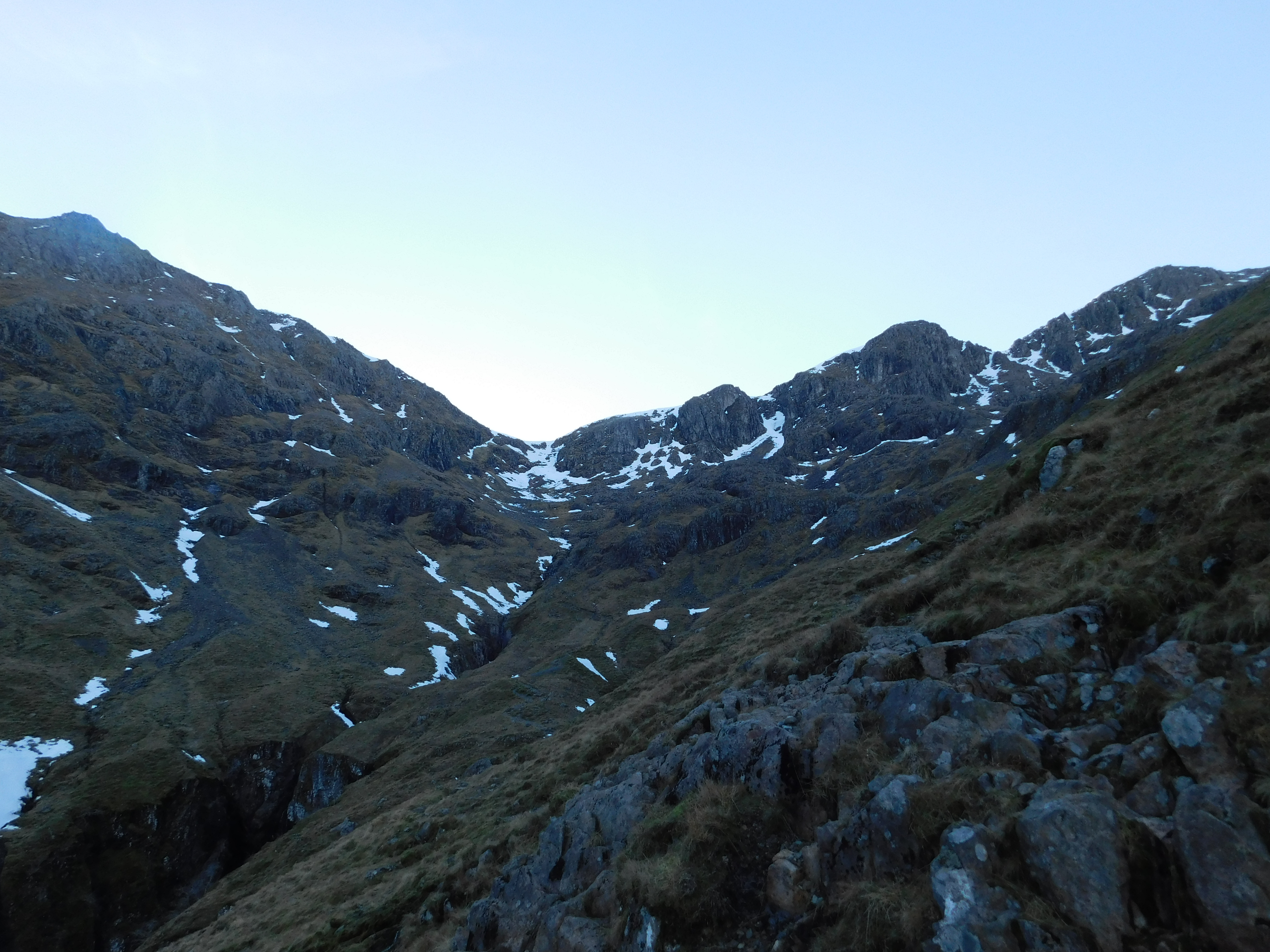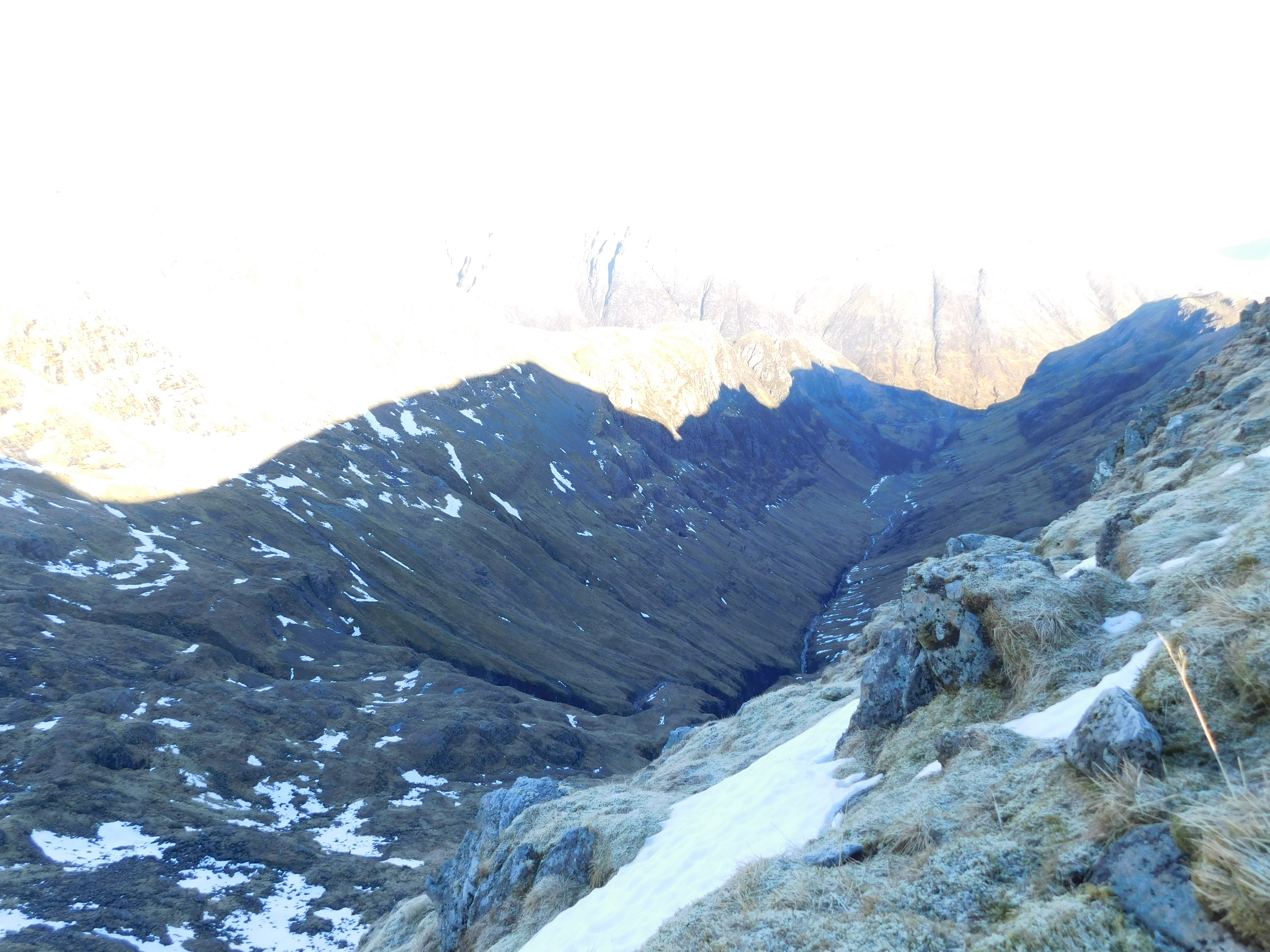 No me demoro mucho tiempo, que en Enero oscurece muy pronto y quiero disfrutar de lo que queda con calma. El descenso por la cresta SE, que incluye dos insignificantes «jorobas», es una gozada. Buen sendero con más hierba que piedras, una pendiente muy cómoda que no hace sufrir las rodillas y por supuesto estupendas vistas, con algunos precipicios interesantes hacia la izquierda… Los manchones de nieve que jalonan la ruta no suponen ningún problema. Es aquí también que encuentro a dos personas, las únicas con las que coincidiré hoy, y que se dirigen ahora hacia el Bidean Nam Bian. Así es que alcanzo la hendidura del collado Bealach Dearg, desde el que parte el sendero que, recorriendo el valle Coire Gabhail, desciende hasta la carretera.
