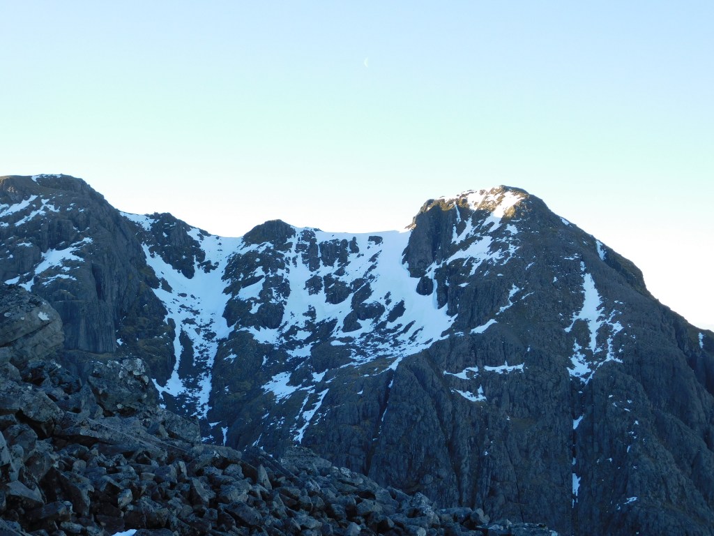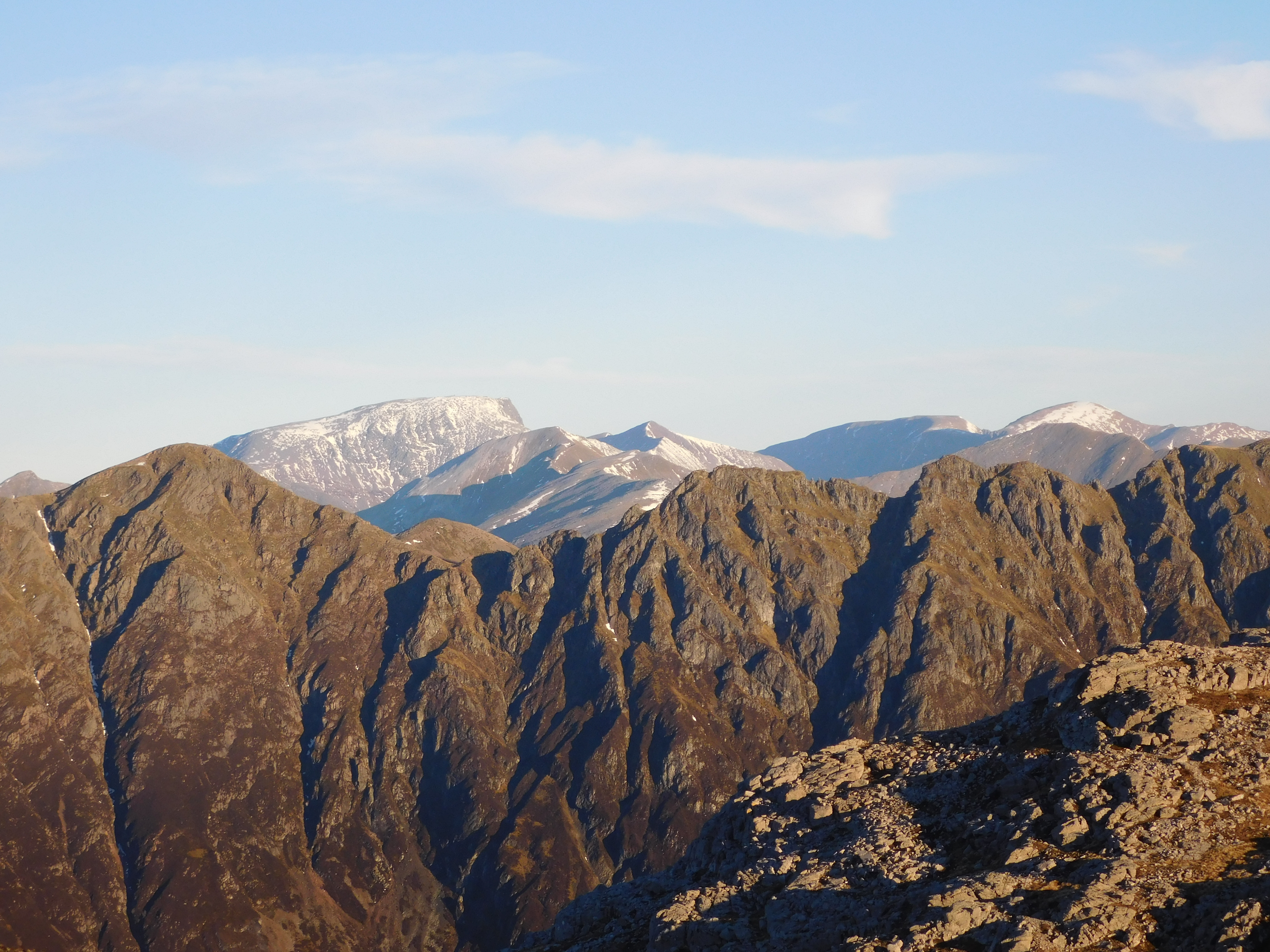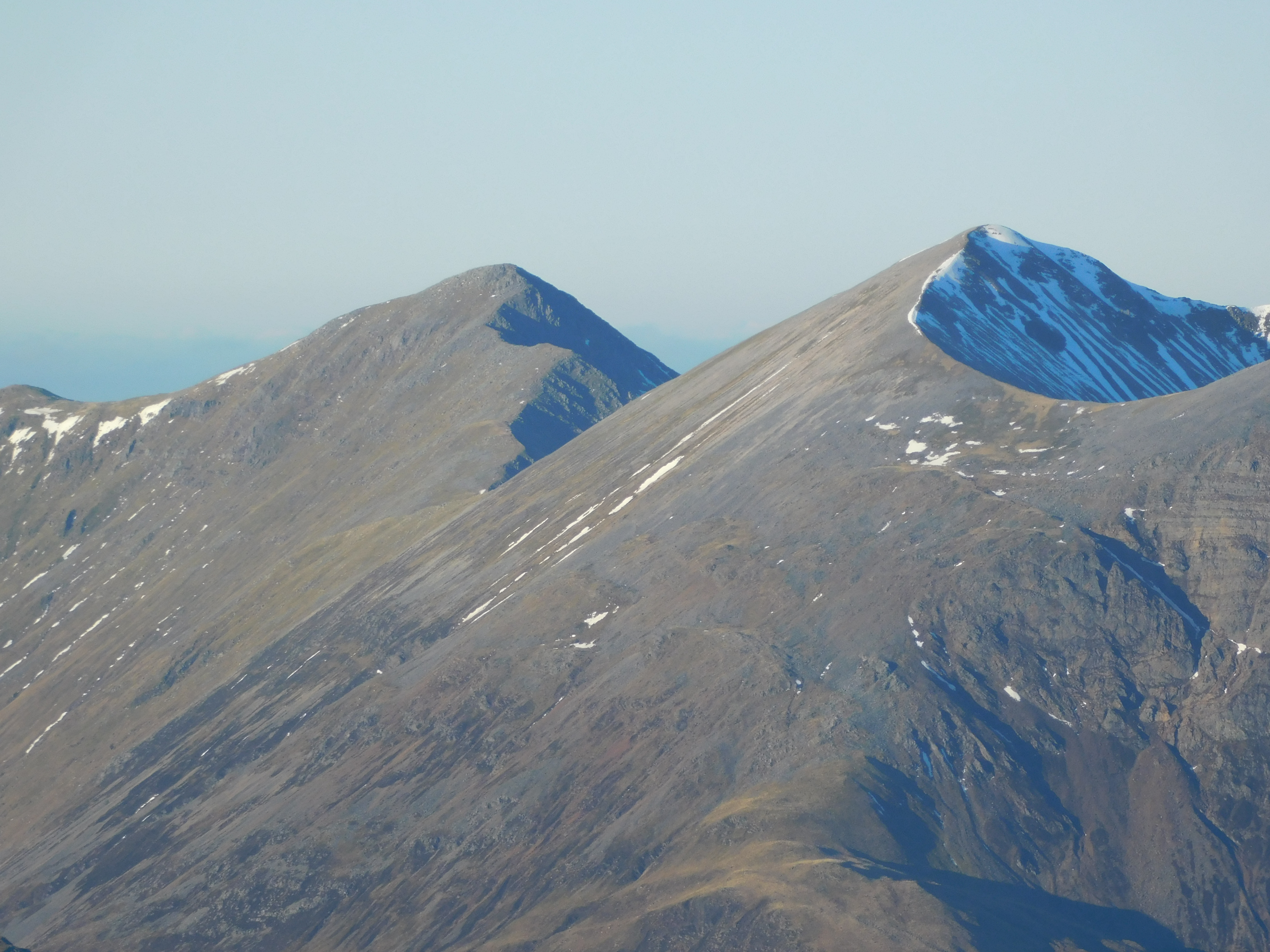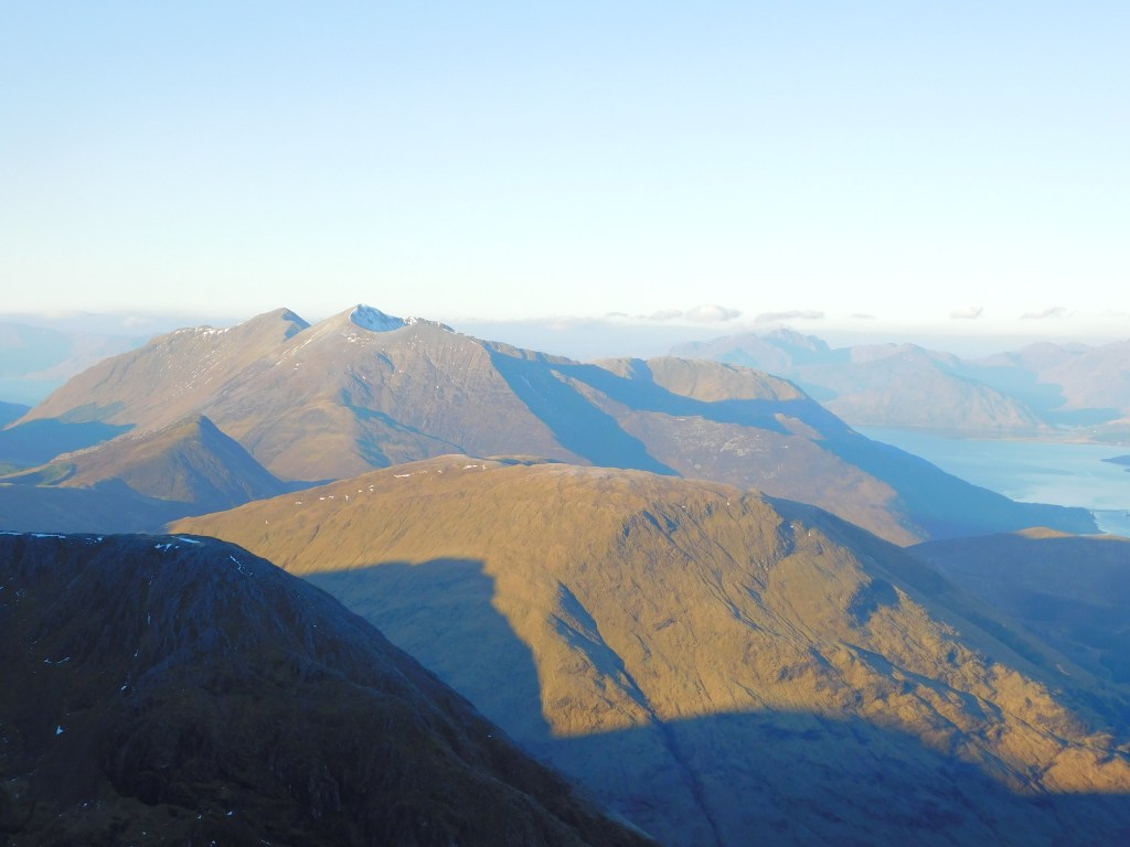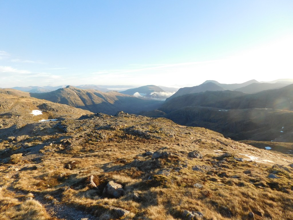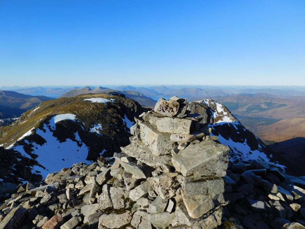 Poco antes de las 10.30 llego a la primera cima del día, marcada con un gran hito de piedra. Una merecida parada contemplativa, y para reponer fuerzas. Ha sido una ascensión sostenida y exigente. Naturalmente, las vistas son excelentes, con una completa perspectiva de los dos objetivos restantes del día. Muy próximo, al SW, el Bidean Nam Bian, una grandiosa muralla compuesta de varias cumbres poco diferenciadas; la cresta de menos de 1 km que separa ambas cimas, tiene tramos que desde aquí dan hasta miedo… Dos valles más allá, hacia el SE, el Stob Coire Sgreamhach es una cuña oscura que penetra en la cegadora luz del Sol.