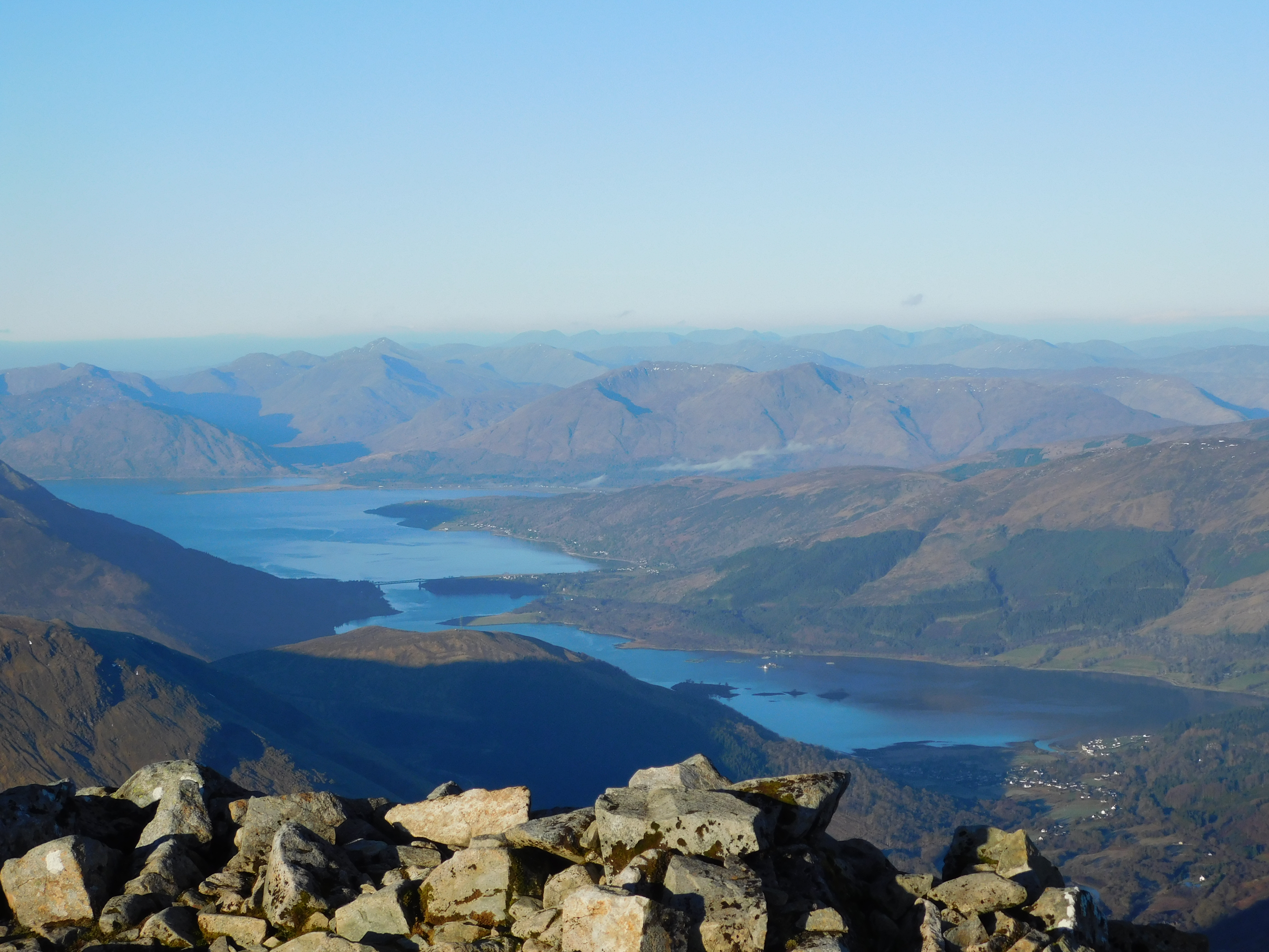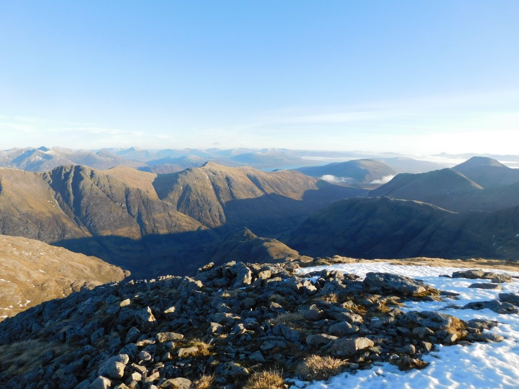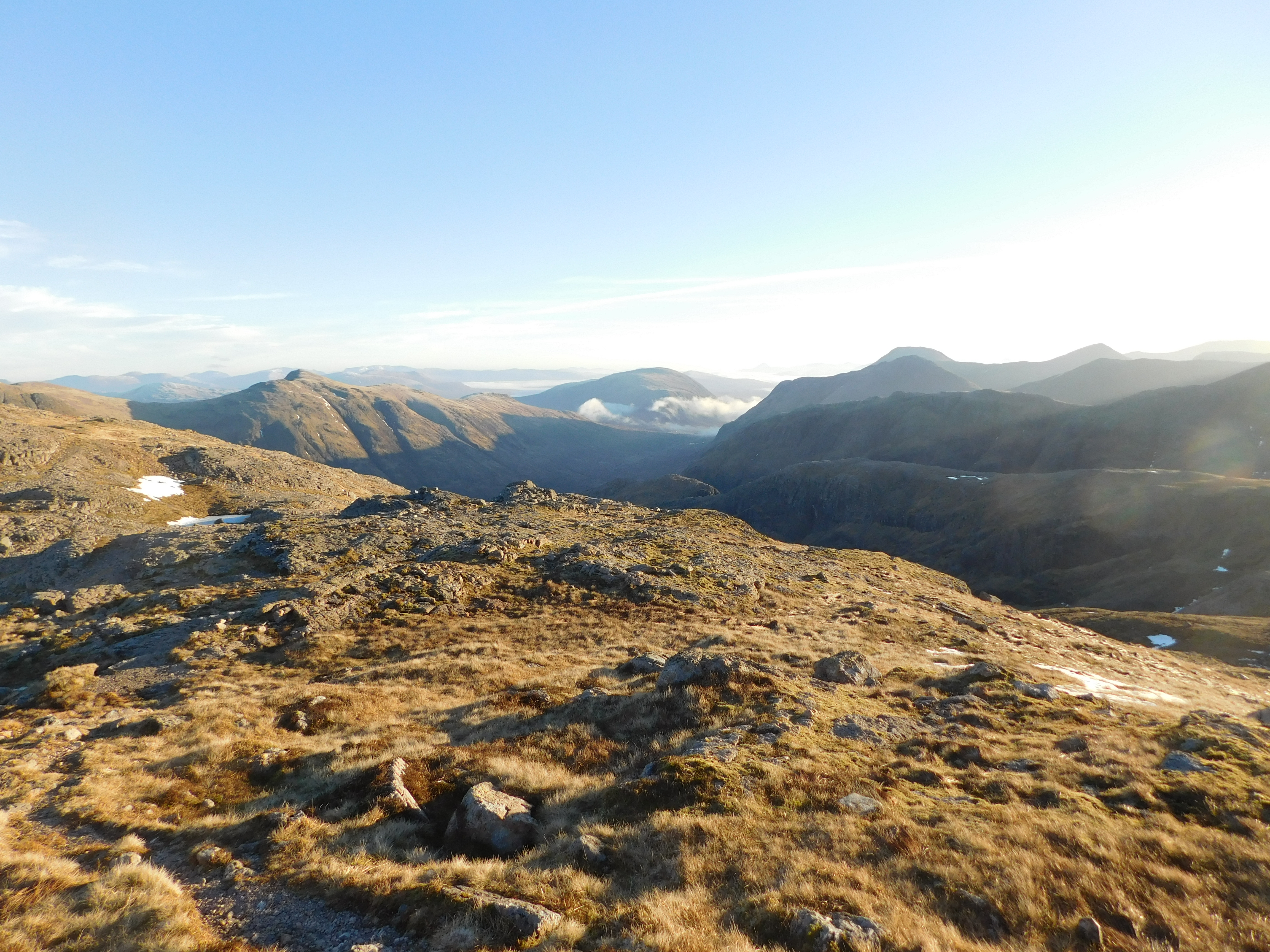 Beinn a’Bheithir, Ben Nevis, Mamores, Loch Leven (que pese a su nombre no es un lago, sino un fiordo), Aonach Eagach y el propio valle de Glencoe… La vista hacia el Norte es superior a la que me encontraré desde el Bian Nam Bian. Así que me detengo aquí un buen rato. Este monte no será un Munro, pero qué más da, tiene mucho más carácter que tantos de la lista «oficial». Además, el GPS me lee once metros más que los 1115 que marcan los mapas…