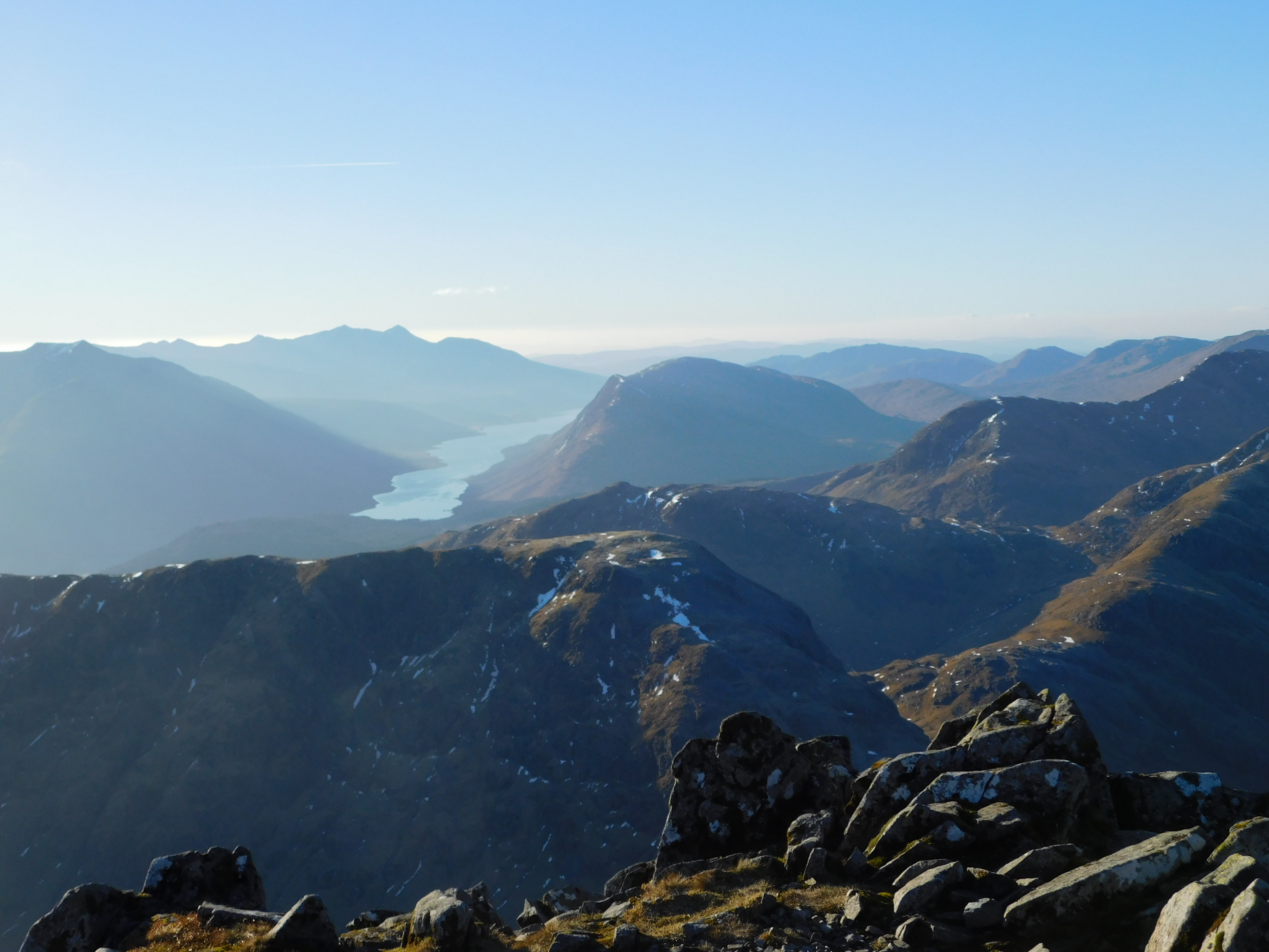 El tiempo no presenta trazas de cambiar y la visibilidad sigue siendo excelente. Desde aquí el panorama cambia bastante; básicamente se me abre todo el horizonte sur, desvelando la cara menos instagramable de estas montañas. El dramatismo de la vertiente septentrional es sustituido por un relieve intrincado pero más dulce, y que llega a transmitir una sensación de aislamiento mayor. En particular atraen la vista el glen y el loch Etive (otro fiordo con nombre de lago); parajes verdaderamente recónditos que no sufren ni de lejos la masificación turística de Glencoe. Esperemos que continúen así por muchos años.