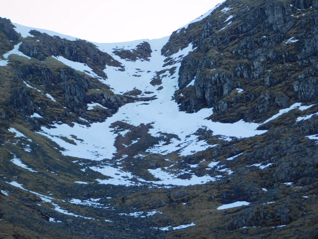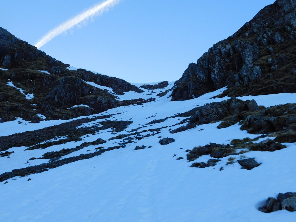 Las reseñas indican que la parte superior del corredor de acceso al valle es trabajosa, debiendo seguir una difuminada traza a través de un incómodo terreno de rocas rotas y pedrera. Sin embargo, mi problema no es este, sino ese «pequeño» nevero que ya había distinguido desde la cima de Stob Coire nan Lochan, justo debajo del collado. Porque en enero y en Escocia, la cresta que acababa de recorrer marca el límite de la sombra perpetua en este valle orientado al norte. Ergo, el neverito de marras se encontraba bien congelado, lo que unido a la inclinación de los primeros metros implicaba uso obligatorio de crampones y bajar con buena técnica.